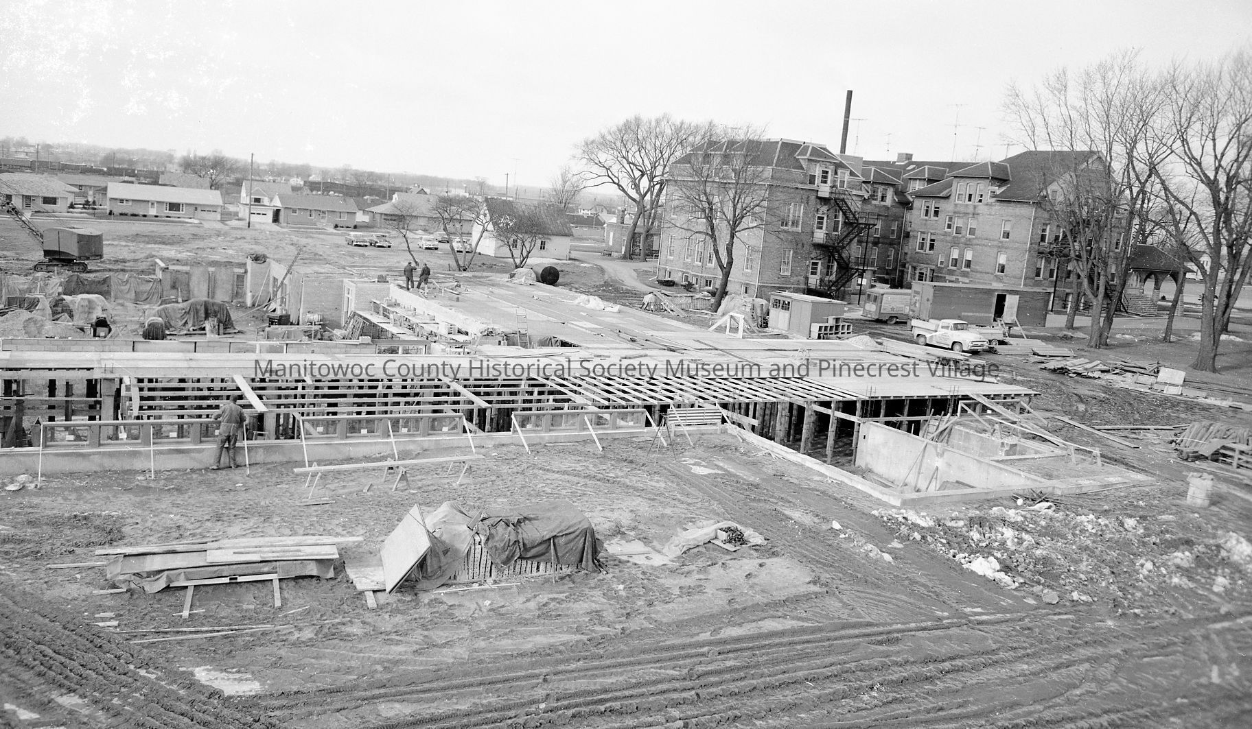 Park Lawn Nursing Home, 1308 South 22nd Street Manitowoc, foundation work near completion and some first floor beams in place. Looking west homes are on South 24th Street. Photograph taken on January 14th, 1960.Made/Created