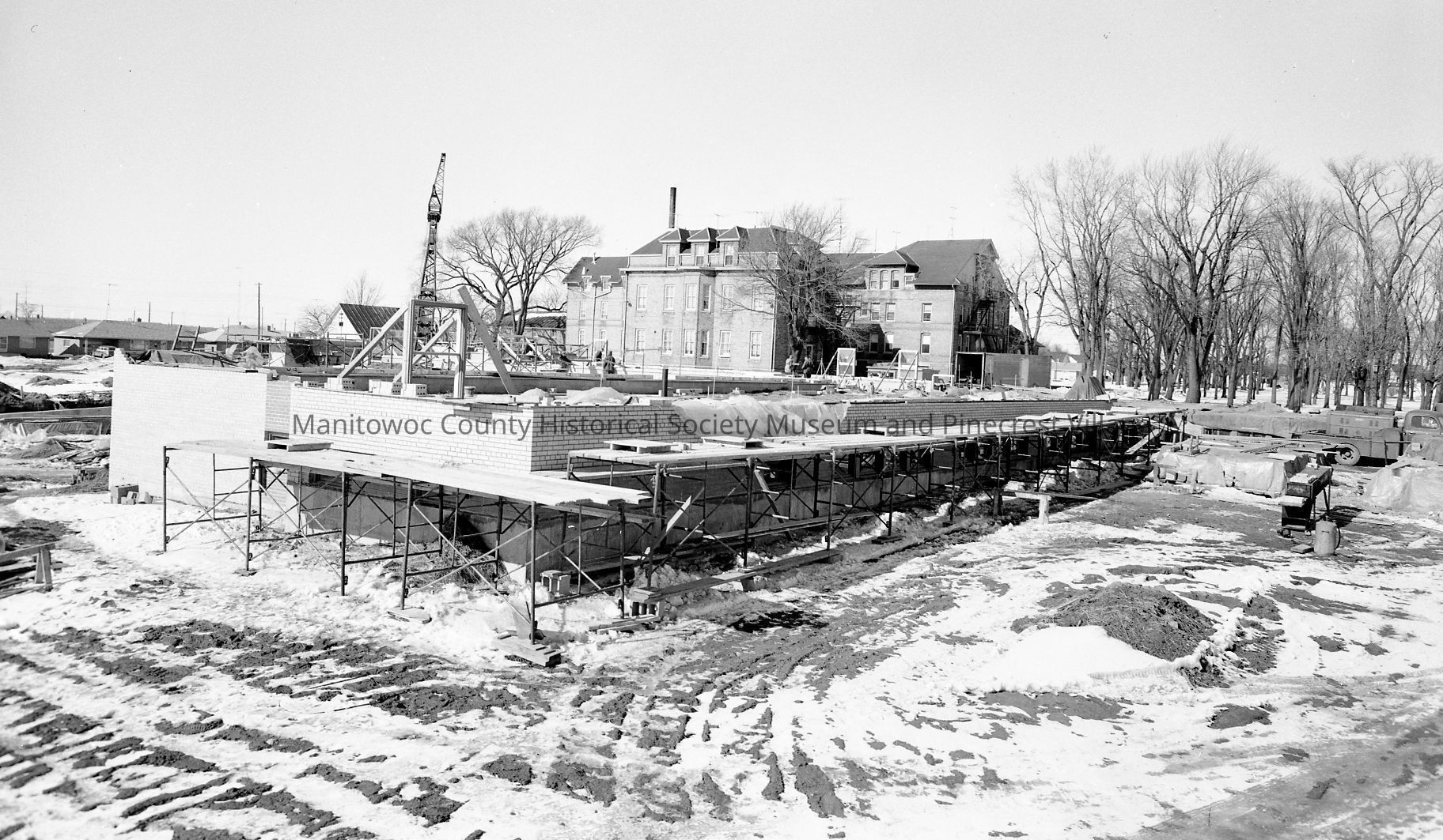 Park Lawn Nursing Home, 1308 South 22nd Street Manitowoc, first floor work started. Looking northwest old Shady Lane is in background. Photograph taken on February 16th, 1960.Made/Created
