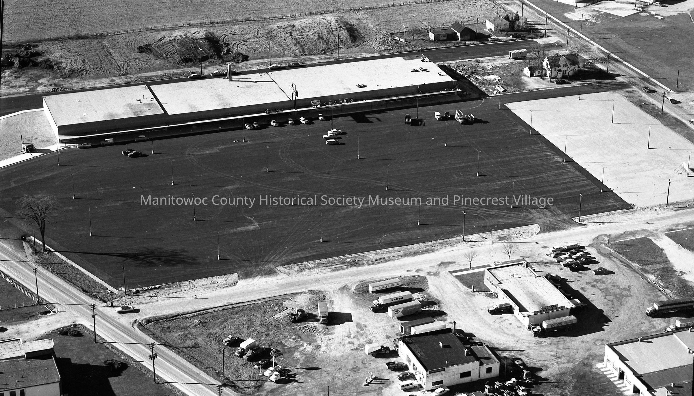 Aerial of Park Plaza Shopping Center, 1100 South 30th Street Manitowoc. At left is Calumet Ave. Upper right corner is the old Custerdale activity center and school. At bottom right is George Clark Transit Company, 2902 Calumet and in front is Truck Service Company, 2904 Calumet Ave. On South 30th Street is Olsen Transportation Company, 1035. Photograph taken on November 17th, 1958.Made/Created