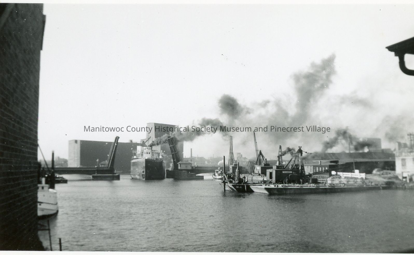 Black & White - Carferry Pere Marquette #18 coming out through the 10th St. bridge in Manitowoc, WI. looking from the 8th St. bridge. At right is McMullen & Pitz Co. equipment and in background is elevator B.