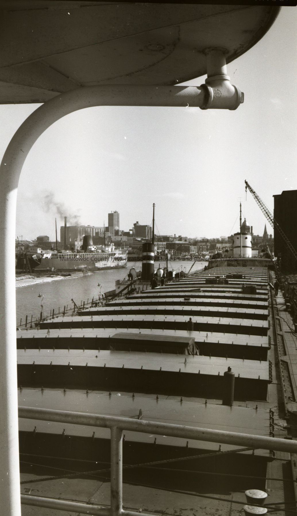 Philip Block docked near Elevator B. A carferry is at the Soo Line slip at left. Photo was taken from backside of pilothouse looking to the stern. Photograph taken February 21st, 1955.Made/Created