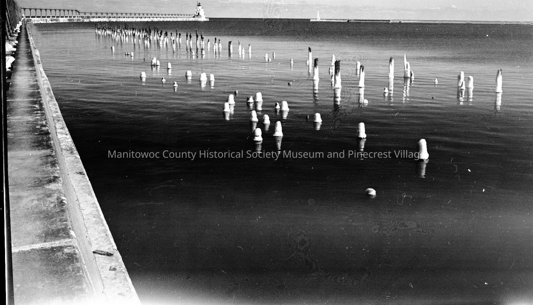 Manitowoc north and south piers and harbor with ice. Looking from northside pier. Photograph taken in March 1964.