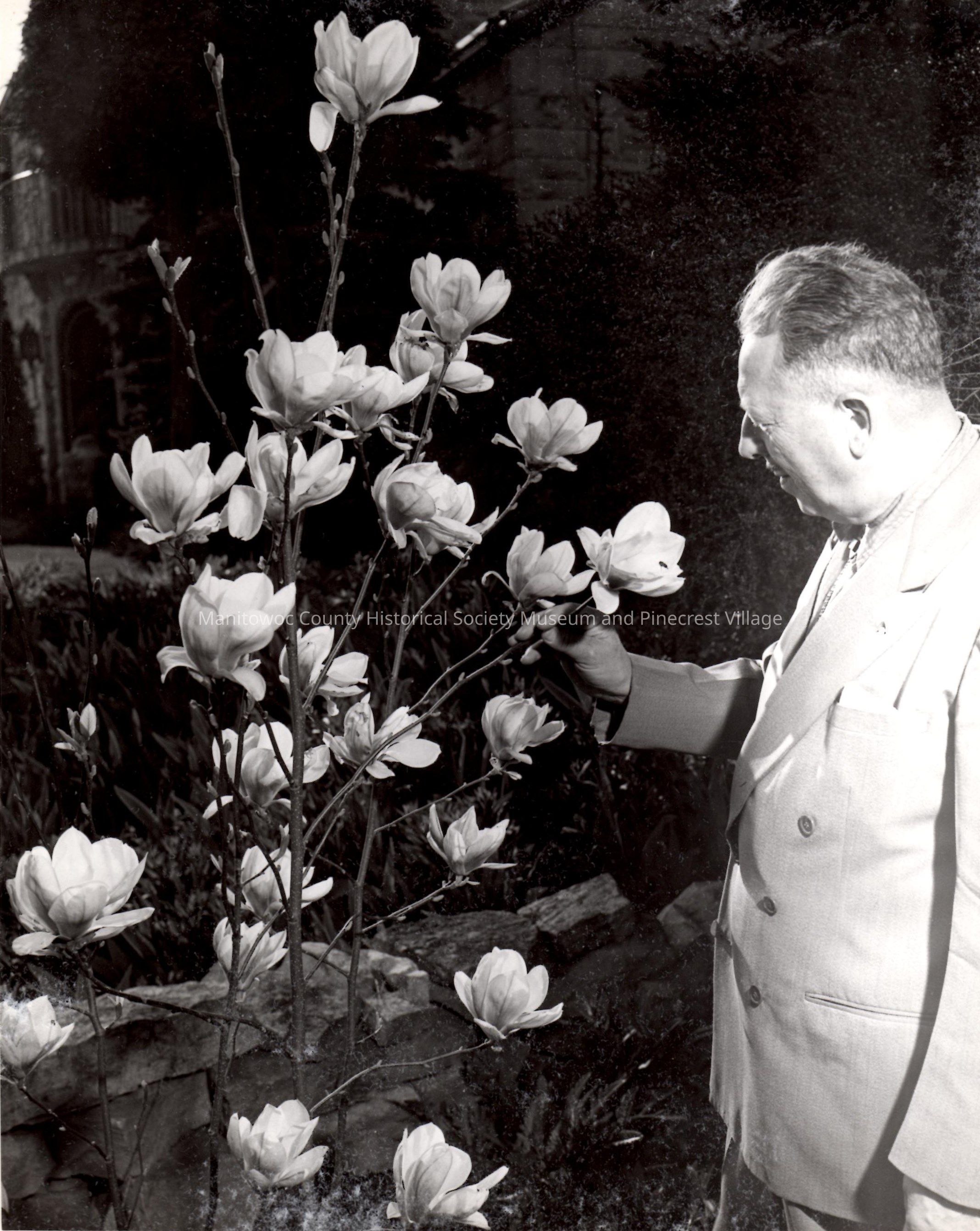 Black and white Junias Pleuss checking flowers at his home on Lindbergh Drive, Manitowoc.