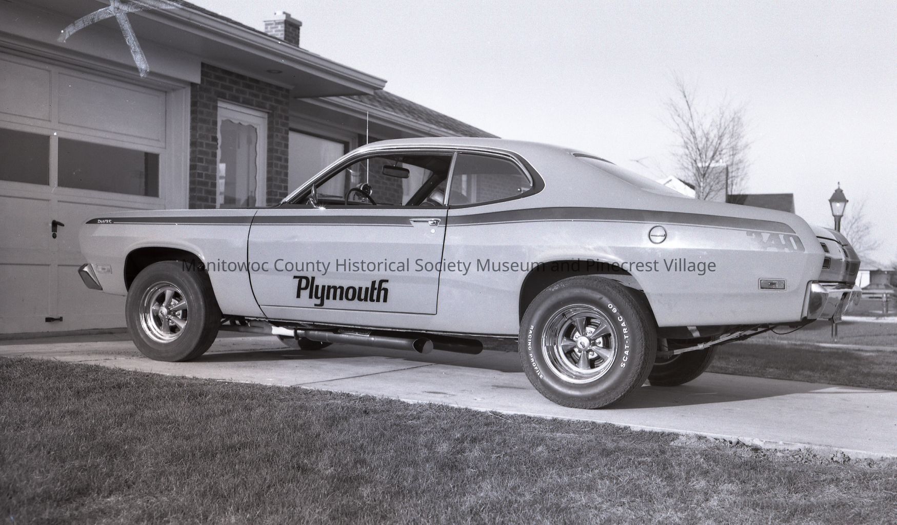 Black and white photo of a Plymouth Duster. Photograph taken on May 9th, 1972.