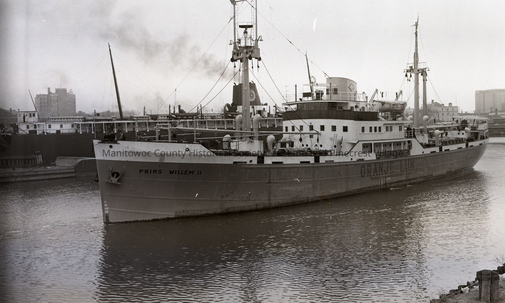 Foreign ship Prins Willem II going up river past Soo Line slip in Manitowoc. Photograph taken on May 2nd, 1956.
