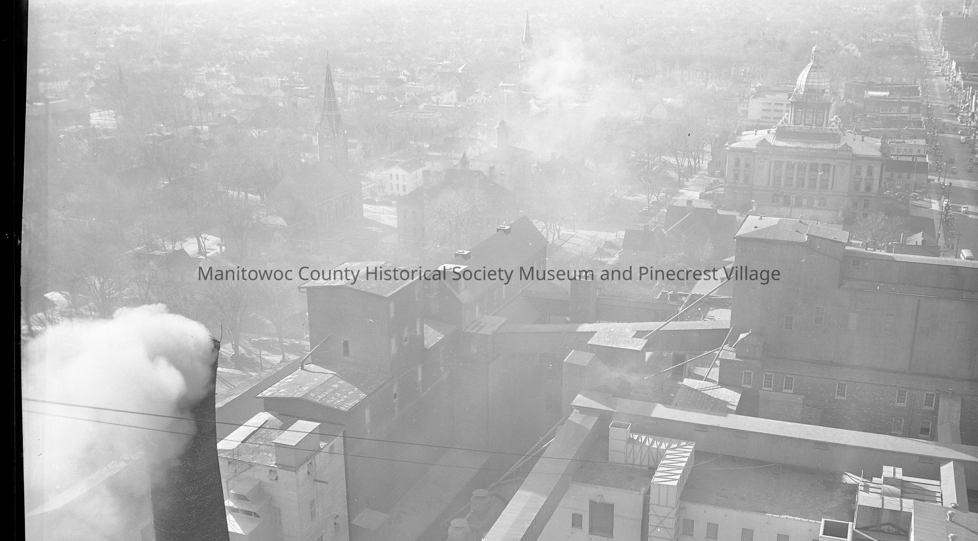 Rahr Malting, Manitowoc; looking west toward South 8th Street & Hancock from on top of Rahr Malting. At left is smokestack from boiler room; center left church steeple is First German Lutheran, center top is St. Boniface. Courthouse & Washington street at upper right. Photograph taken on December 10th, 1946.Made/Created