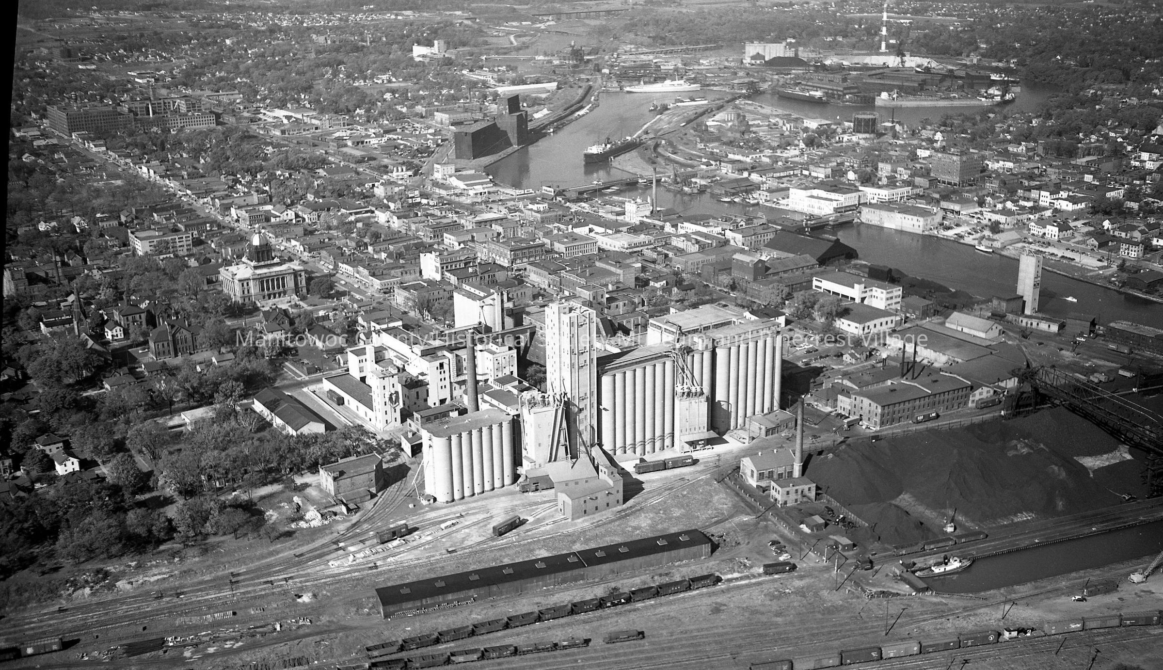 Aerial of Rahr Malting looking west. To the right is Lakeside Packing and just beyond is the Manitowoc County Courthouse. Photograph taken in 1954.Made/Created