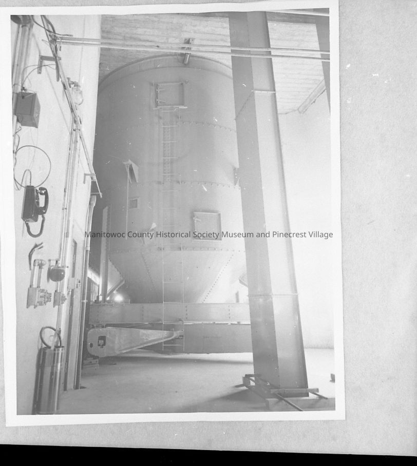 Rahr Malting, Manitowoc; looking at large grain hopper inside; notice spark proof switches and inter-plant phone at left. Circa 1960.Made/Created