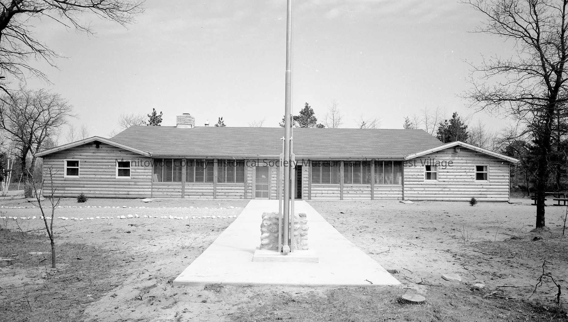 Rahr School Forest Lodge, Sand Bay Road north of Two Rivers, flag pole and front entrance. Photograph taken on May 10th, 1957.Made/Created