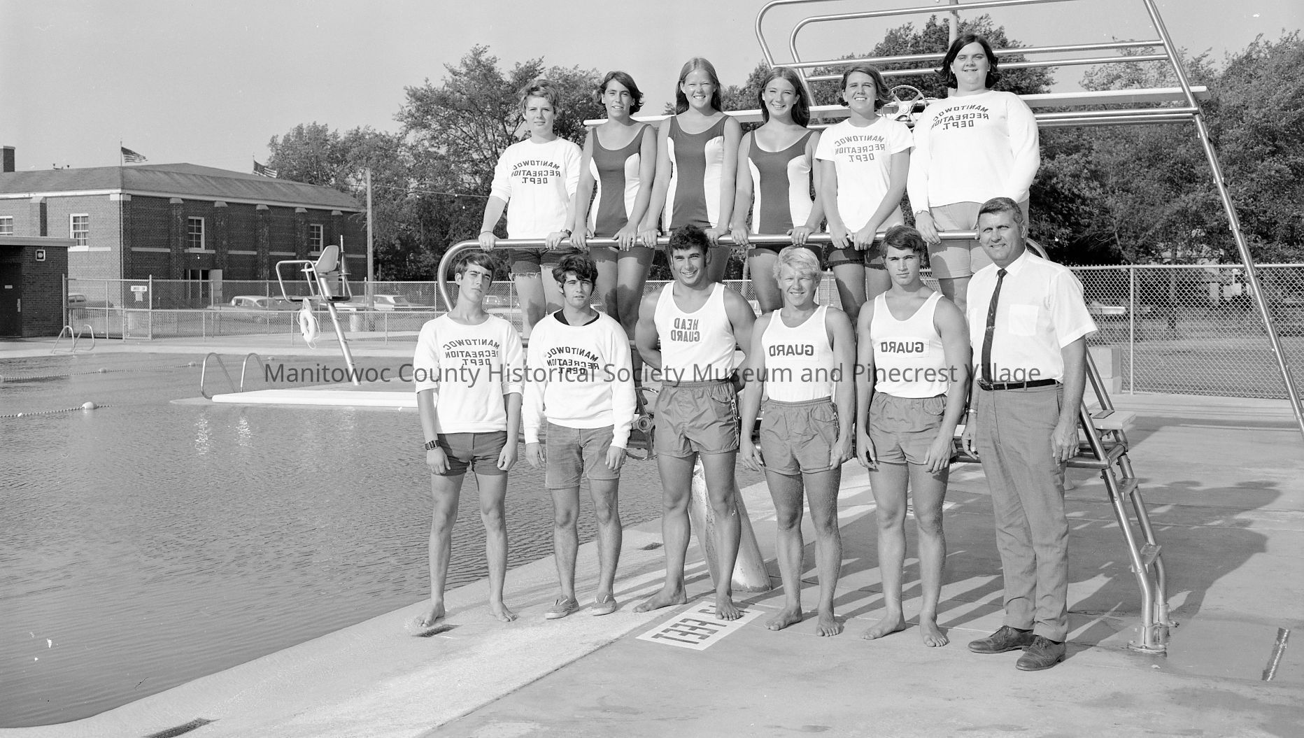 Recreation department life guards at ity outdoor pool, Citizen Park North 18th Street Manitowoc. Photograph taken on August 20th, 1970.Made/Created