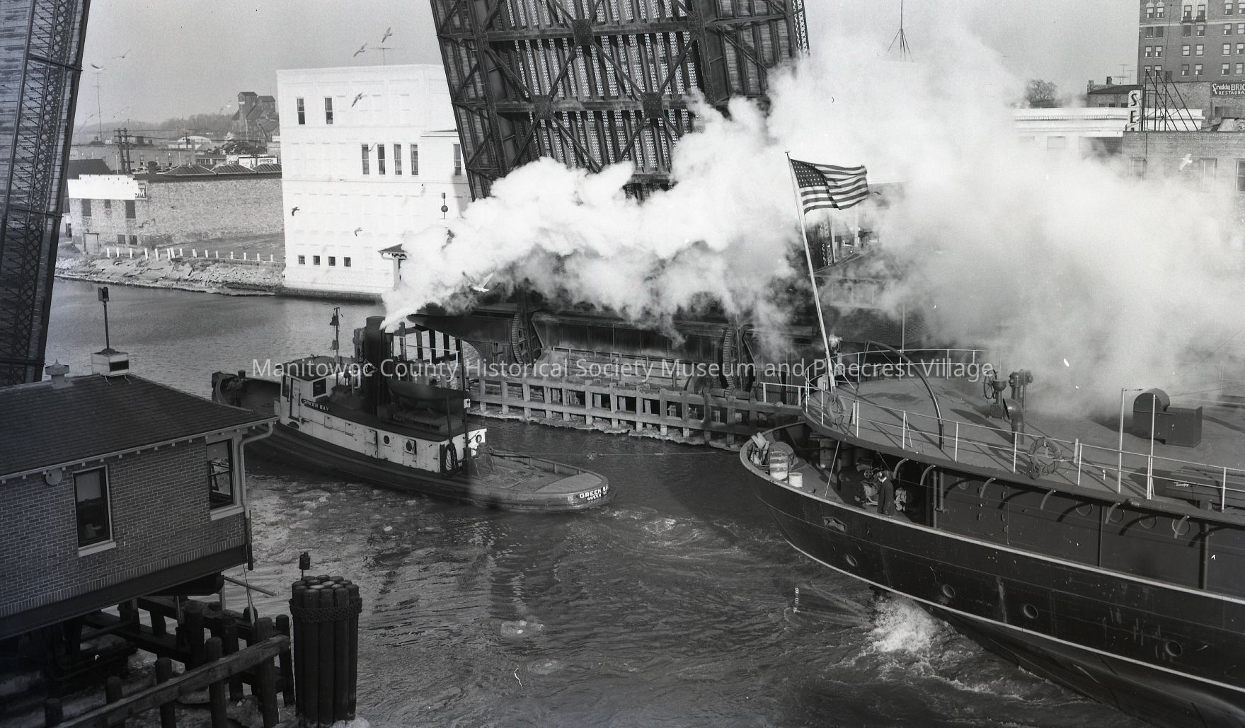 Red Crown tanker being towed backwards up river through the 8th Street bridge by the tug Green Bay. Photograph taken January 29th, 1956.Made/Created