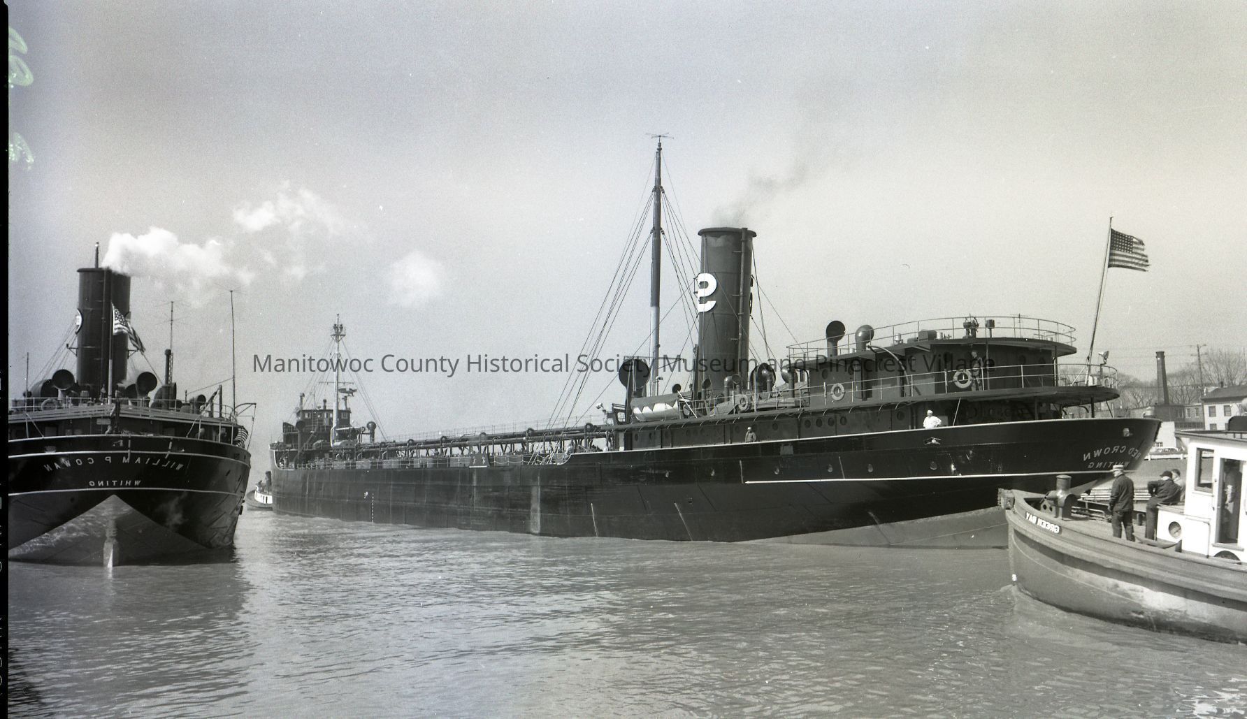Tanker Red Crown going up river with help of tug Green Bay. Docked at right is the William P. Cowan. Photograph taken in 1960.Made/Created