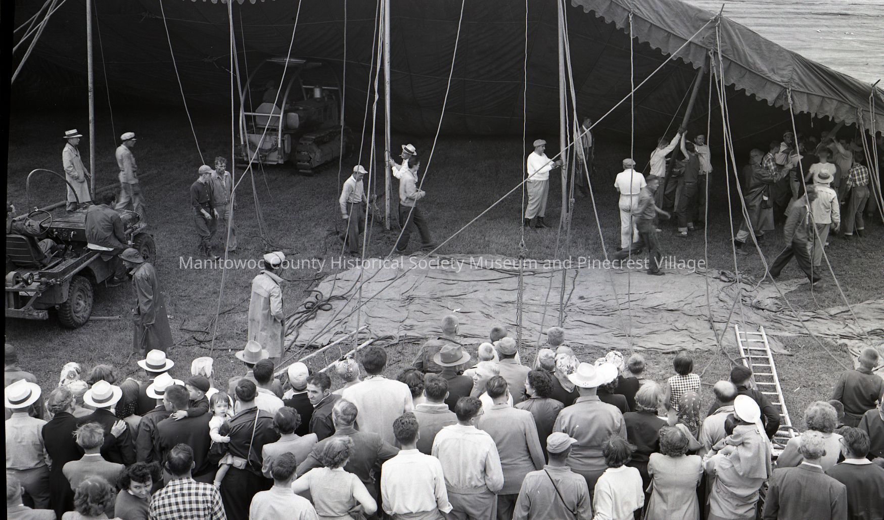 Ringling Bros. Circus at Manitowoc County Fairgrounds setting up the big top. Photograph taken on August 2nd, 1953.Made/Created