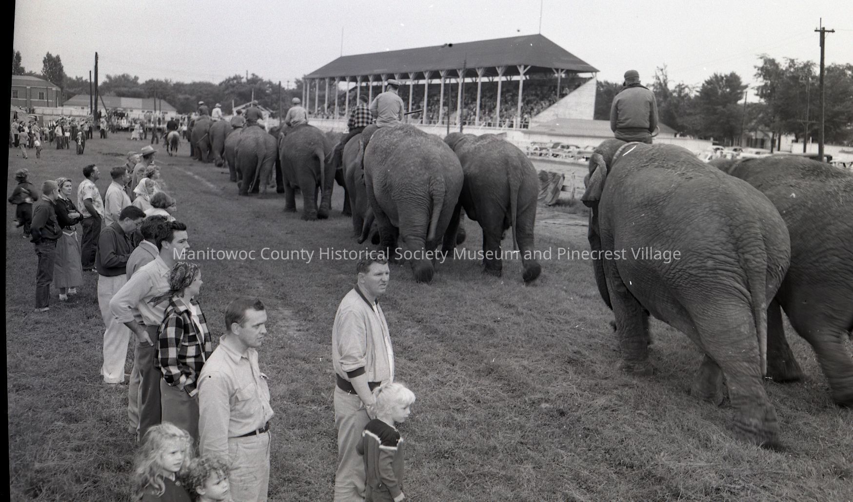Ringling Bros. Circus coming into the Manitowoc County Fairgrounds up from unloading at Franklin Street. Photograph taken on August 2nd, 1953.Made/Created