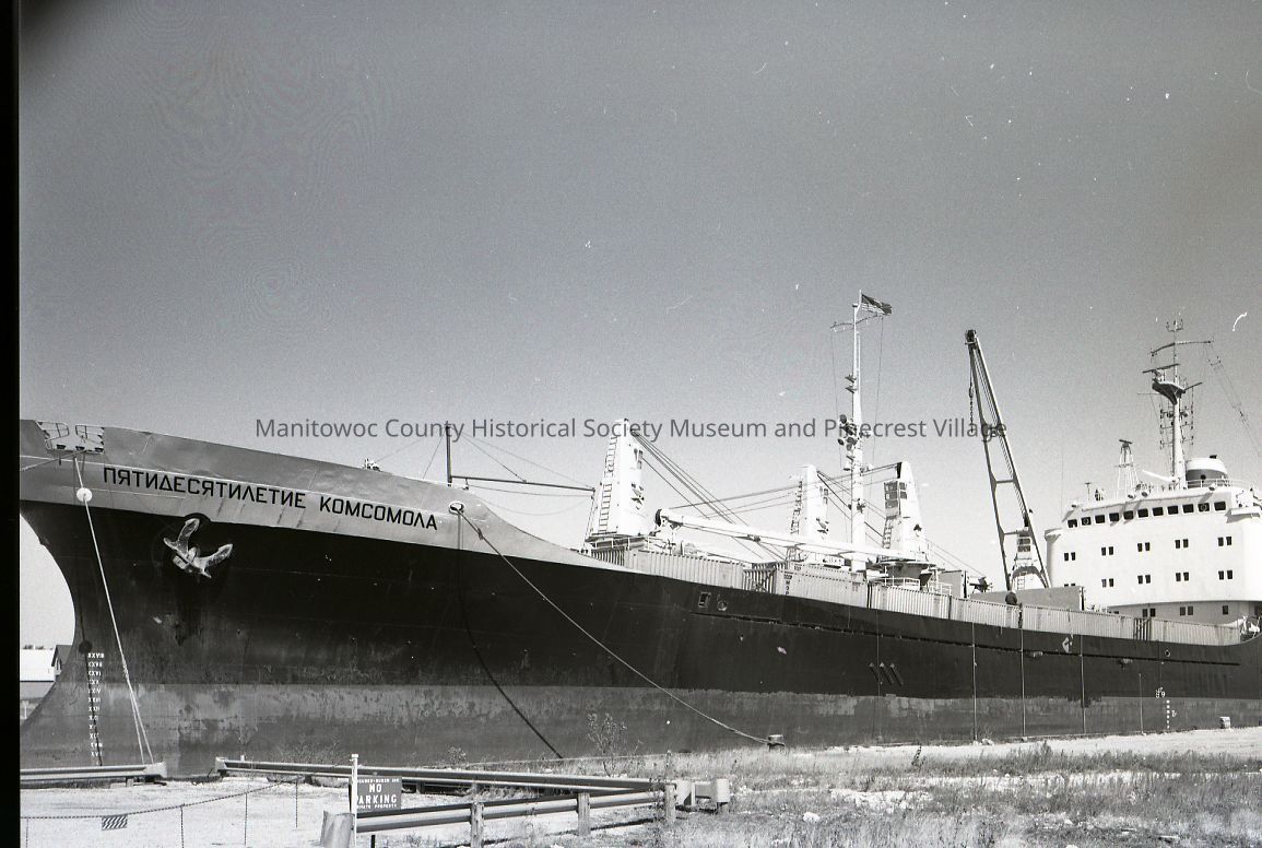 Russian ship, Pyatidesyatiletiye Komsomola, docked along Quay Street in Manitowoc. Photograph taken on September 23rd, 1976.Made/Created