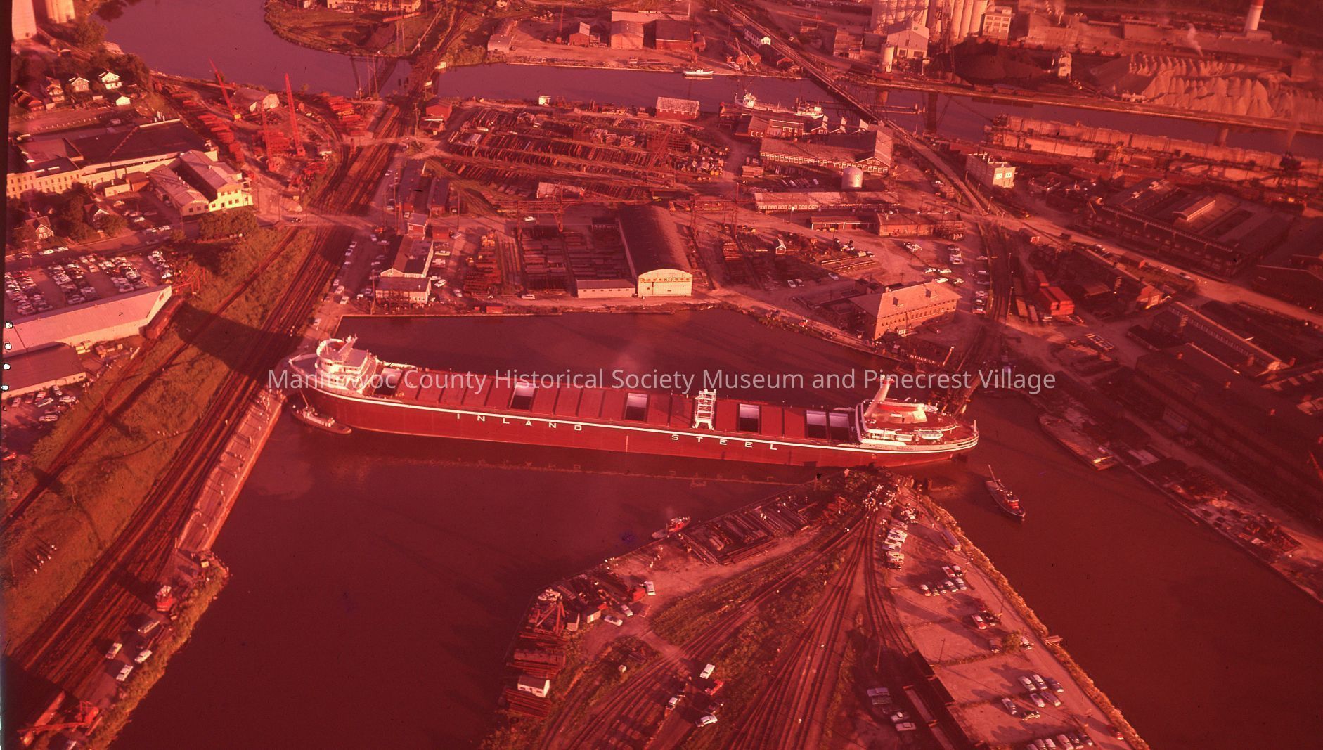 Aerial view of Ryerson leaving Manitowoc Shipbuilding going through Soo Line bridge towards the cut made in the river bank. If this cut had not been made she would have never gotten out. Last lake boat built in Manitowoc.
