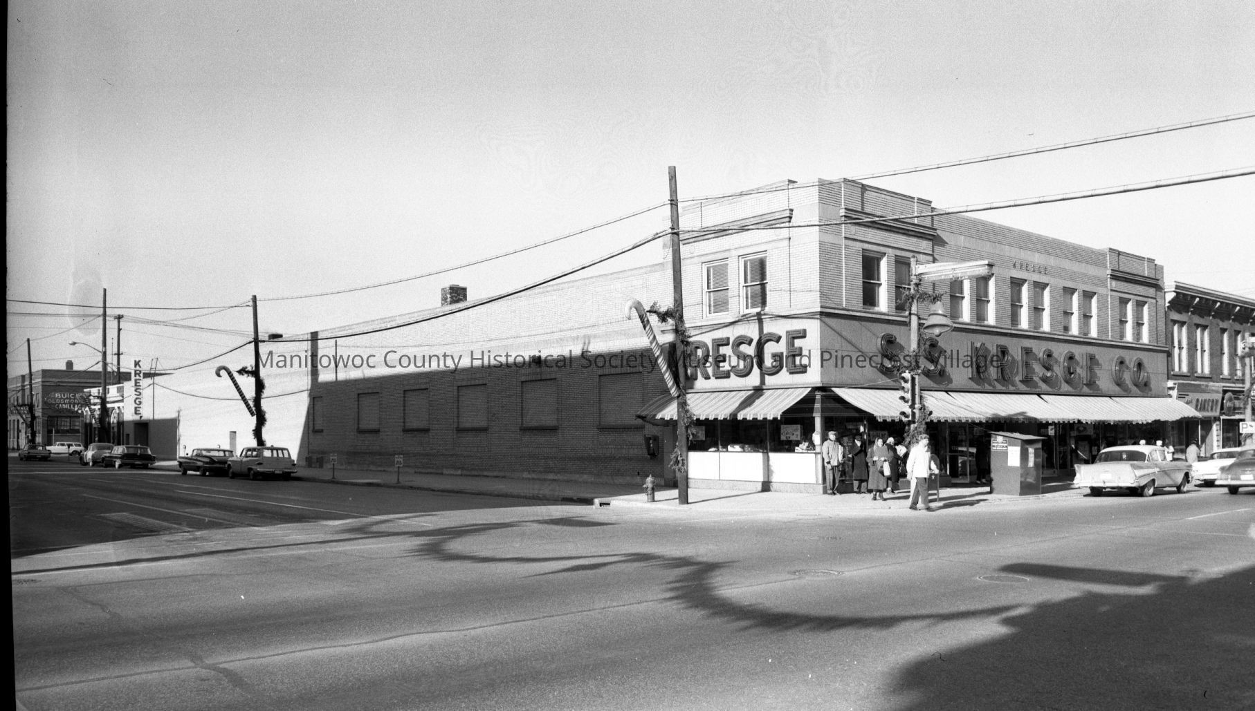 S.S. Kresge Company, 836 South 8th Street Manitowoc At left is the Hamachek car dealership, 822 and Herald Times newspaper, 902 Frankilin. At right is Yindra Bakery, 830; The Coffee Cup, 826; Empress Hat Shop, 824 South 8th Street. Photograph taken on December 11th, 1962.Made/Created