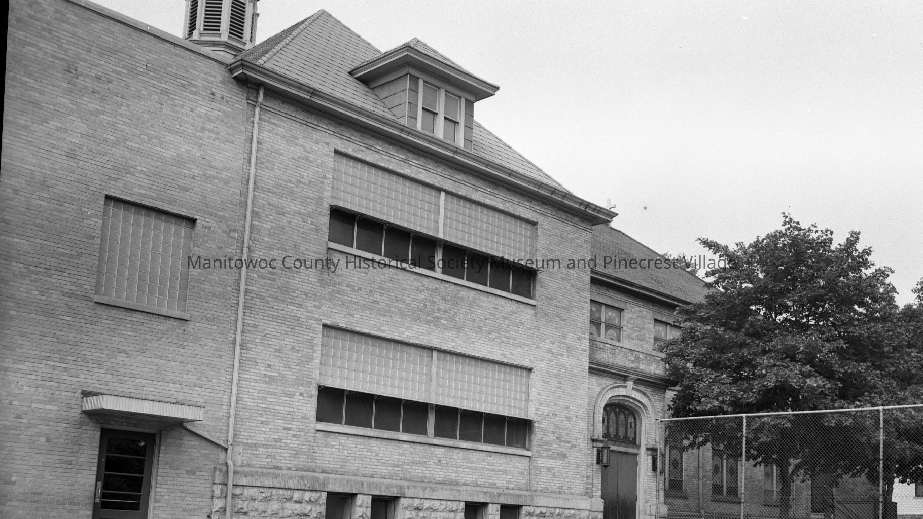 School - Sacred Heart Catholic, 702 State Street Manitowoc. Looking at eastside exits to playground. Photograph taken on October 1st, 1952.Made/Created