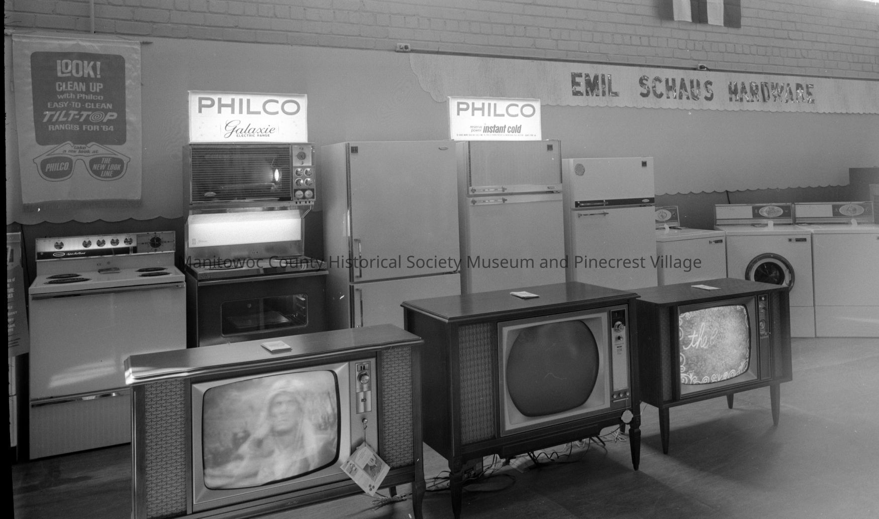 Schaus Hardware TV and appliance display at home show at Manitowoc Armory. Photograph taken on March 21st, 1964.Made/Created