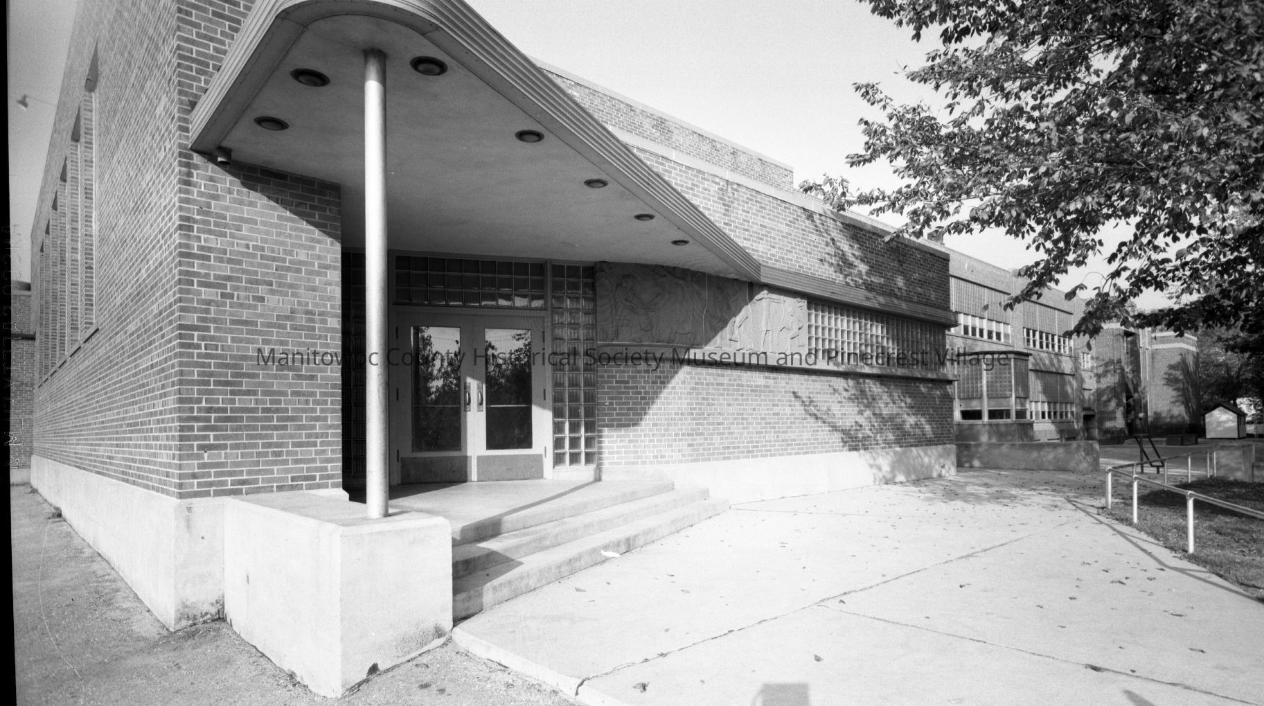 School - Second Jefferson School, 1402 Manila Street Manitowoc. Looking from west end at gym entrance. Photograph taken in 1958.Made/Created