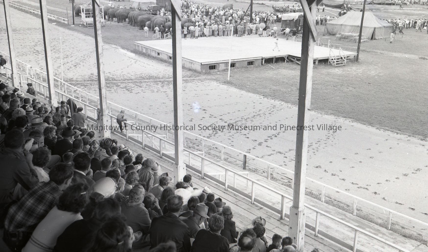 Ringling Bros. circus at Manitowoc County Fairgrounds setting up the big top. Photograph taken on August 2nd, 1953.Made/Created