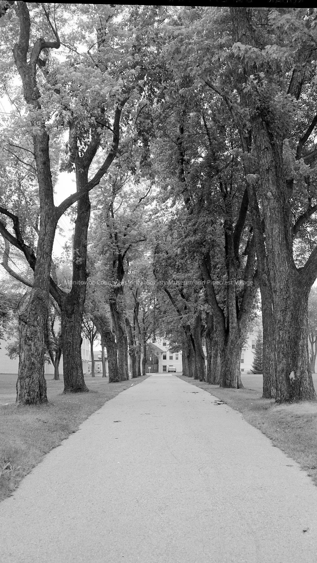 Shady Lane Nursing Home, 1235 South 24th Street Manitowoc, shaded walk-way looking from Hamilton Street. Photograph taken on July 25th, 1971.Made/Created