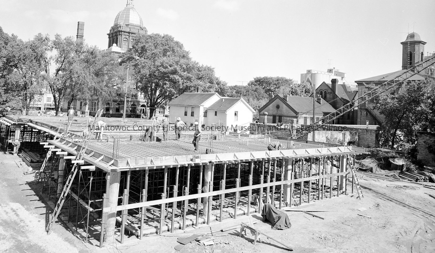 Sheriff's Building, South 9th & Marshall Street Manitowoc, pouring floor. Center right is Schmitz & Schmitz law office, 815 Hancock Street old jail, 805 Hancock Street and old County Courthouse, 1028 South 8th Street. Photograph taken on September 27th, 1960.Made/Created