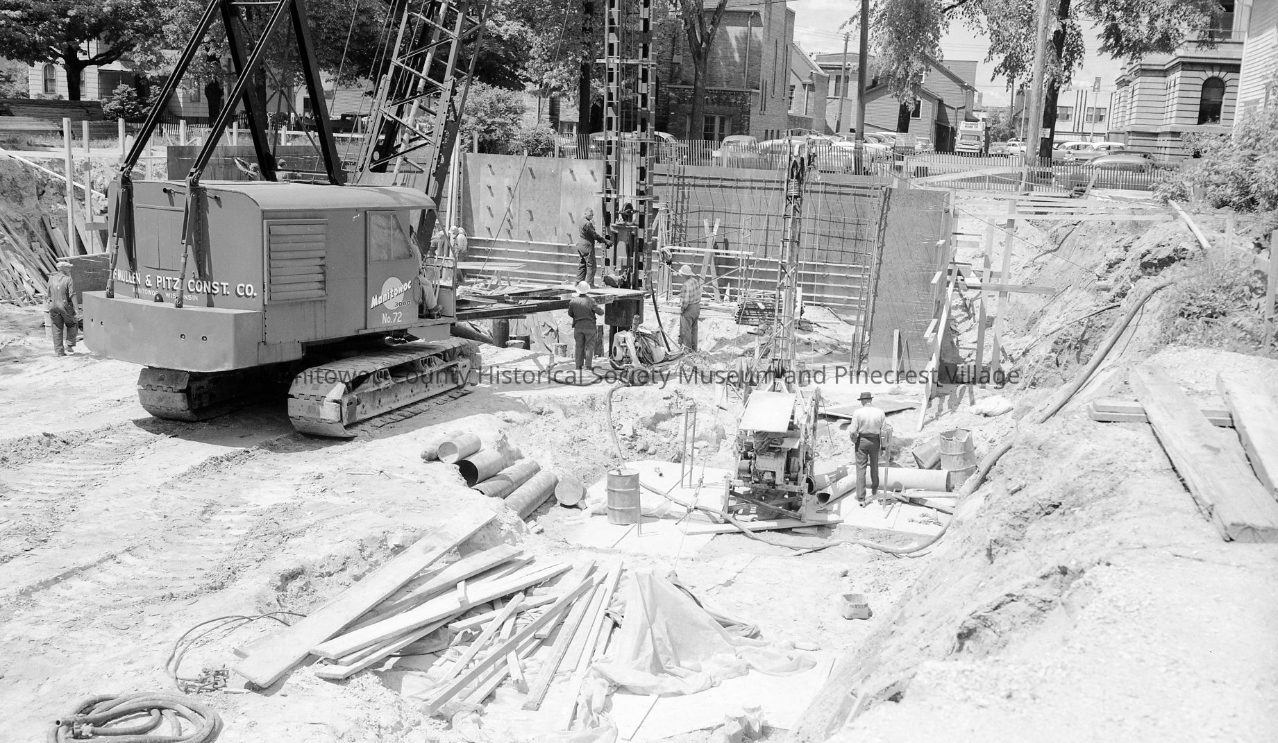 Sheriff's Building, South 9th & Marshall Street Manitowoc, pile driving and wall forms. Looking north building top center is First Reformed Church, 1009 South 9th Street. Photograph taken on June 17th,1960.Made/Created