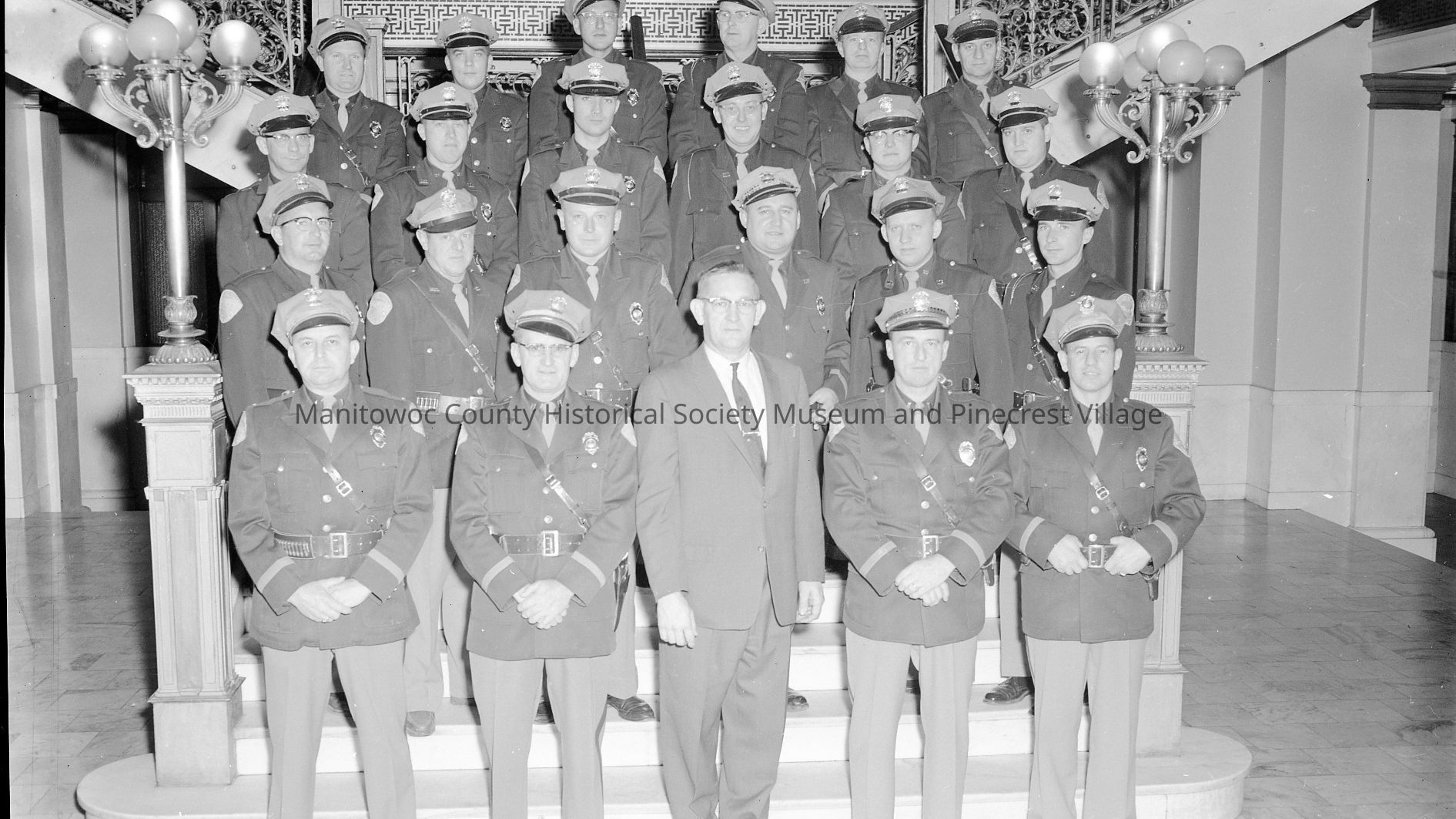 Sheriff's Building & County jail, South 9th & Marshall Street Manitowoc, Manitowoc County traffic officers with Chief Henry Pleuss. Photo taken inside Manitowoc County Courthouse. Circa 1960.Made/Created