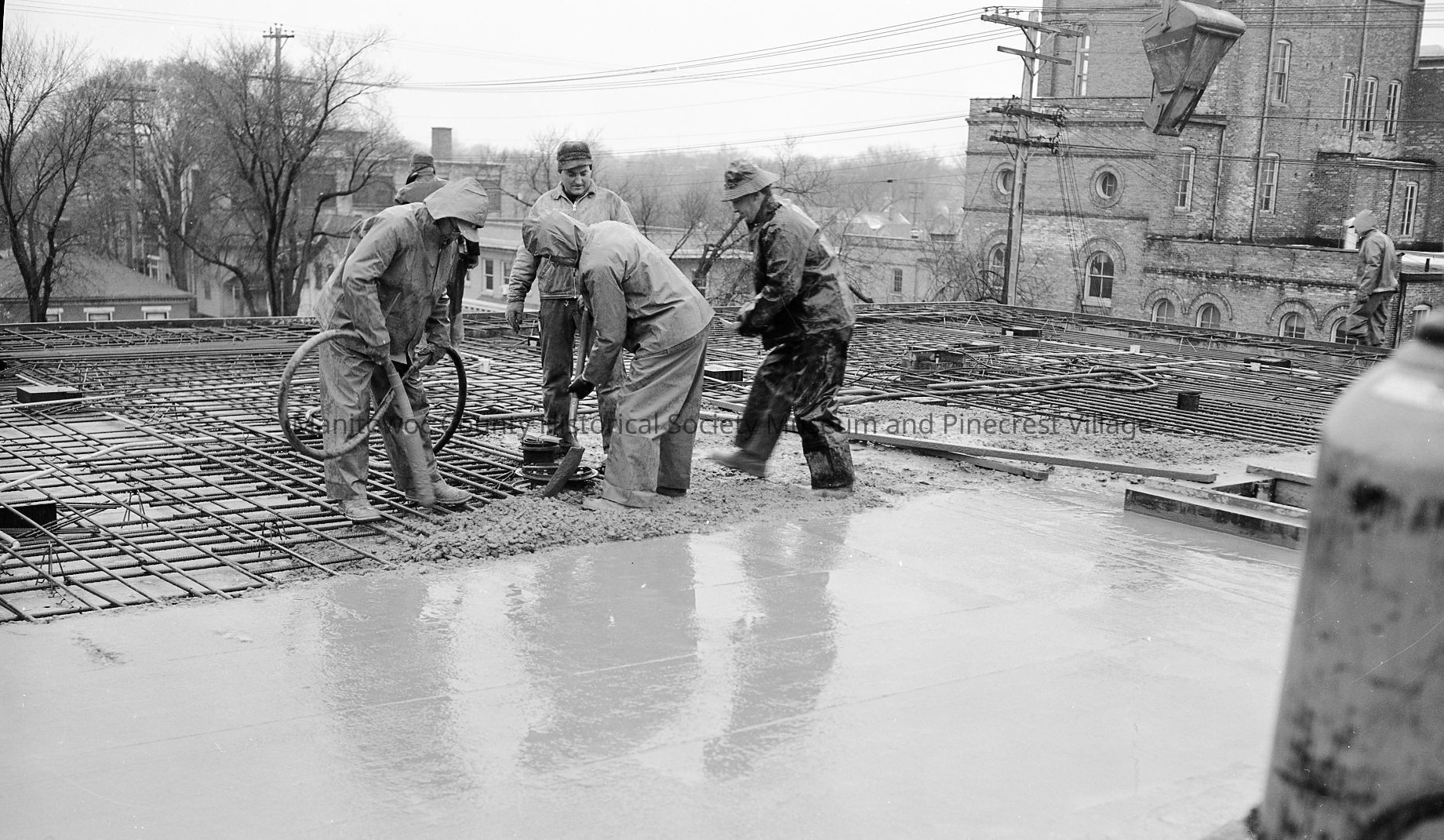 Sheriff's Building & County jail, South 9th & Marshall Street Manitowoc, second story floor being poured. At upper right is old Kingsbury brewery, South 9th & Marshall Street, northwest corner. Photograph taken on November 7th, 1960.Made/Created