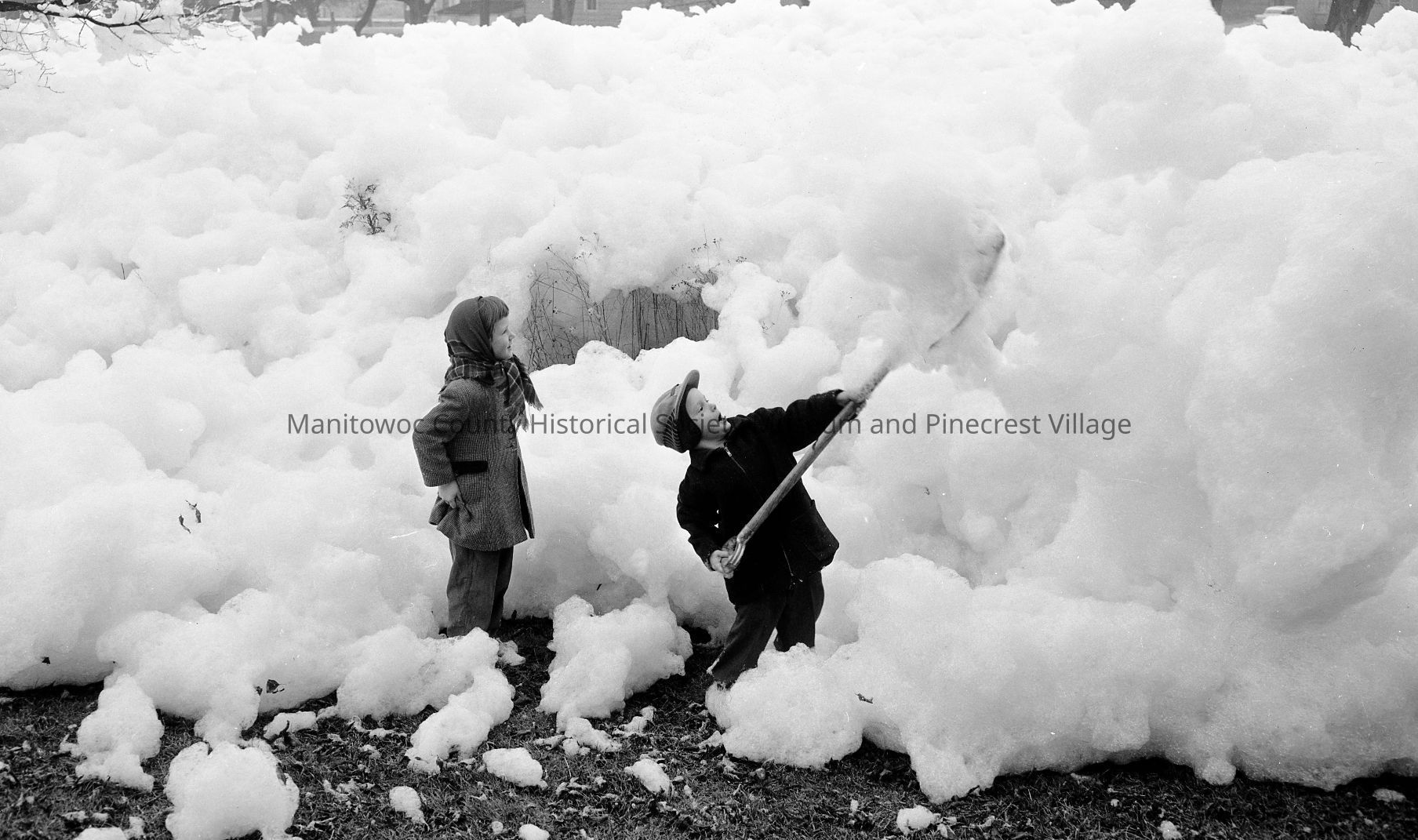 Kids playing in foam on West Twin River in Shoto. Photograph taken on February 23rd, 1961.