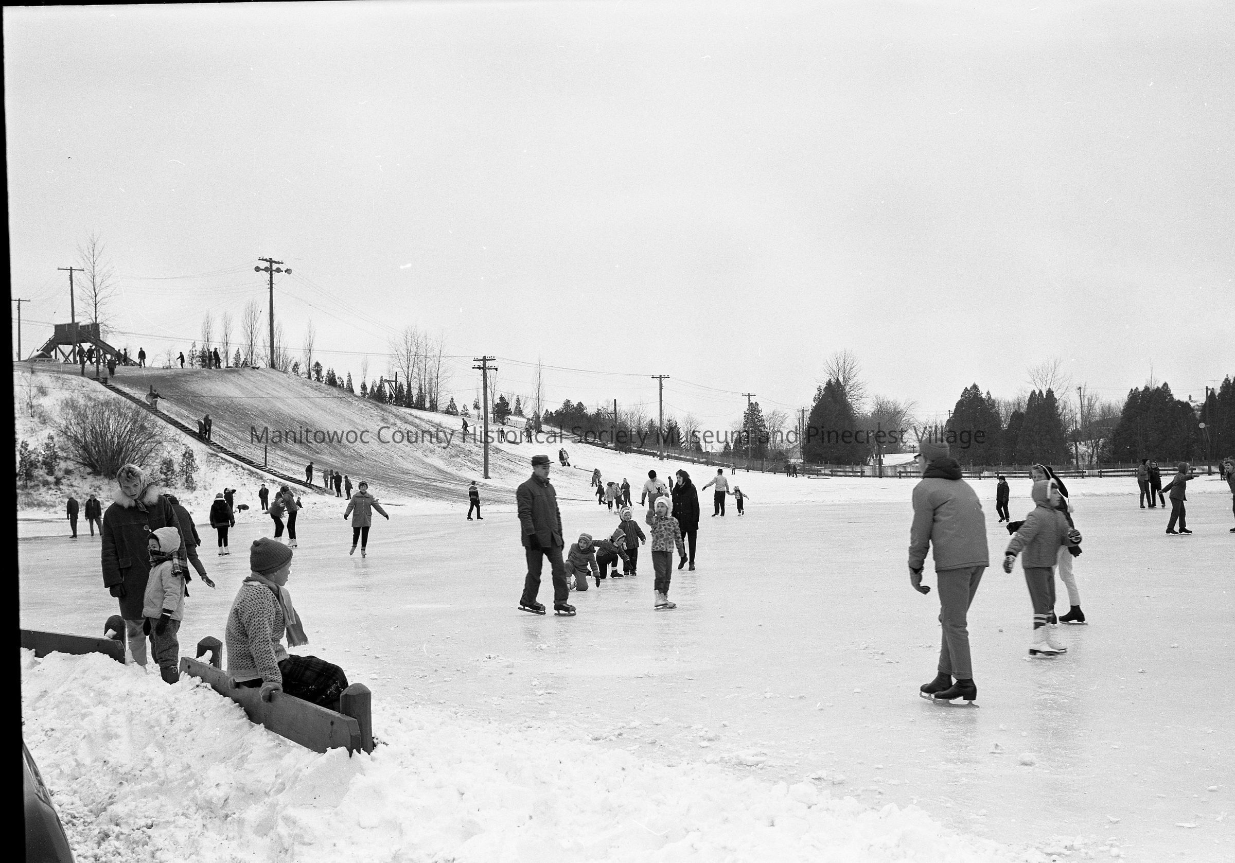 Silver Creek skating rink. Left is sleding hill with old tobaggan slide. Photograph taken on January 10th, 1966.