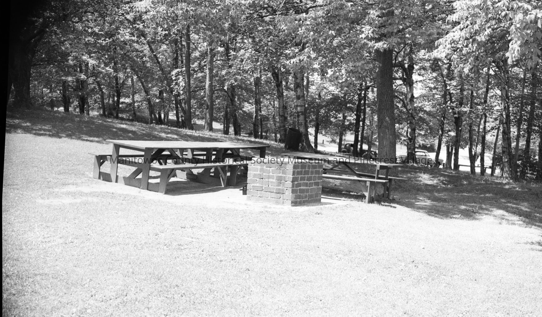 Silver Creek Park Manitowoc, brick fryer and tables in upper level area. Photograph taken on July 10th, 1952.Made/Created