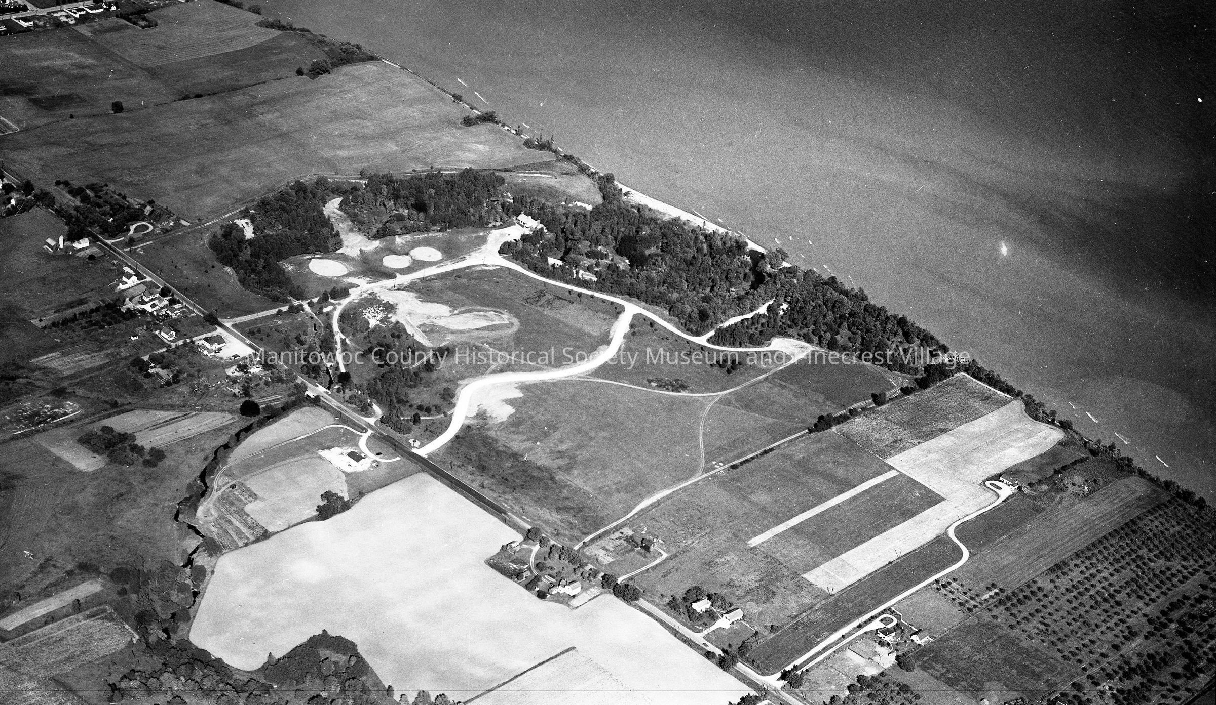 Aerial of Silver Creek Park Manitowoc. Two entrances off South 10 th Street; first is old entrance that went straight ot fieldhouse, second is the present entrance. Photograph taken in October 1953.Made/Created