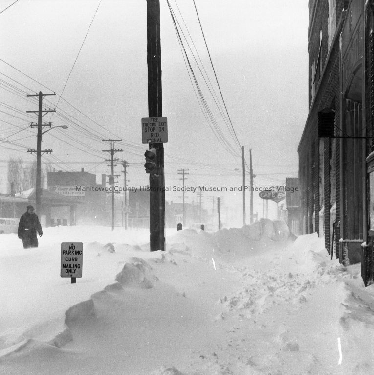Snow piled high on Franklin Street in front of Herald Times newspaper Manitowoc. Photograph taken in March 1964.