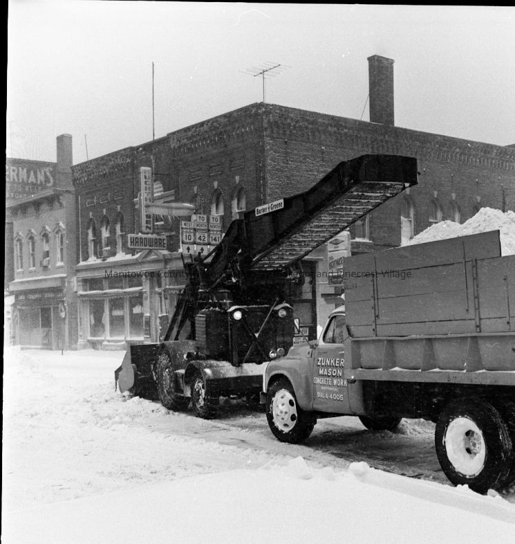 Snow removal at South 8th & Washington Street Manitowoc. Photograph taken in March 1964.
