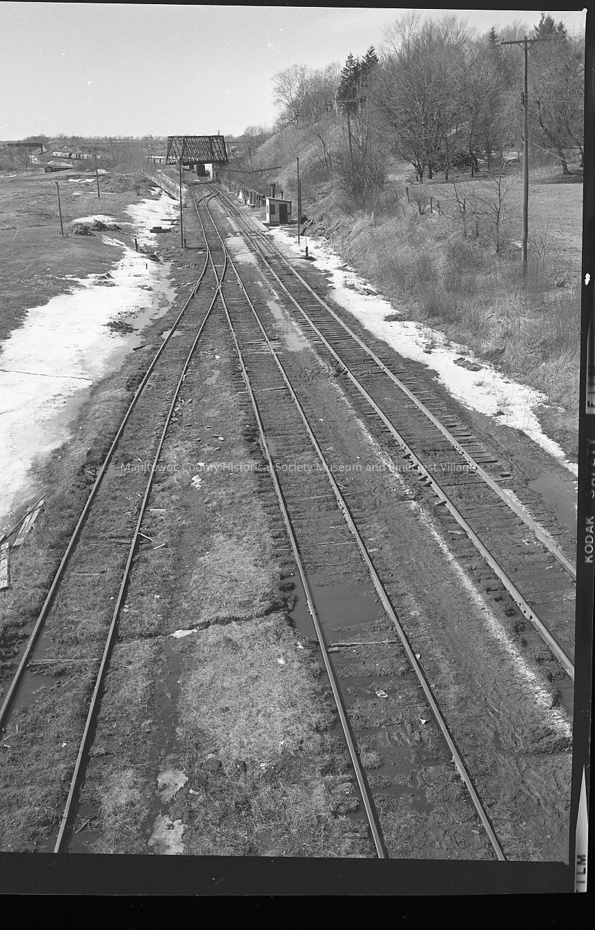 Soo Line mainline leaving Manitowoc weigh scale, small building at right. Photo taken from 18th Street viaduct. At upper right is Evergreen Cemetery and ahead is bridge carrying line to Two Rivers. Photograph taken in 1971.Made/Created