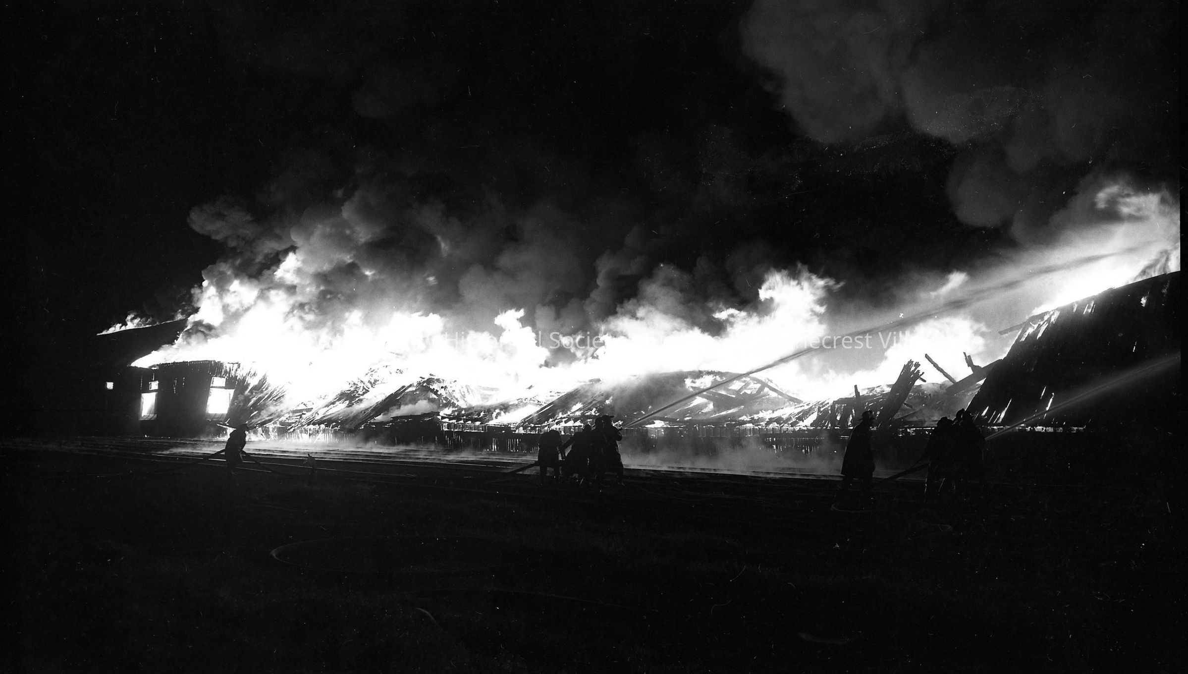 Soo Line RR warehouse fire, Manitowoc Fire rages on as firefighters fight losing cause. Photograph taken on October 28th, 1952 by Daryl Cornick.Made/Created