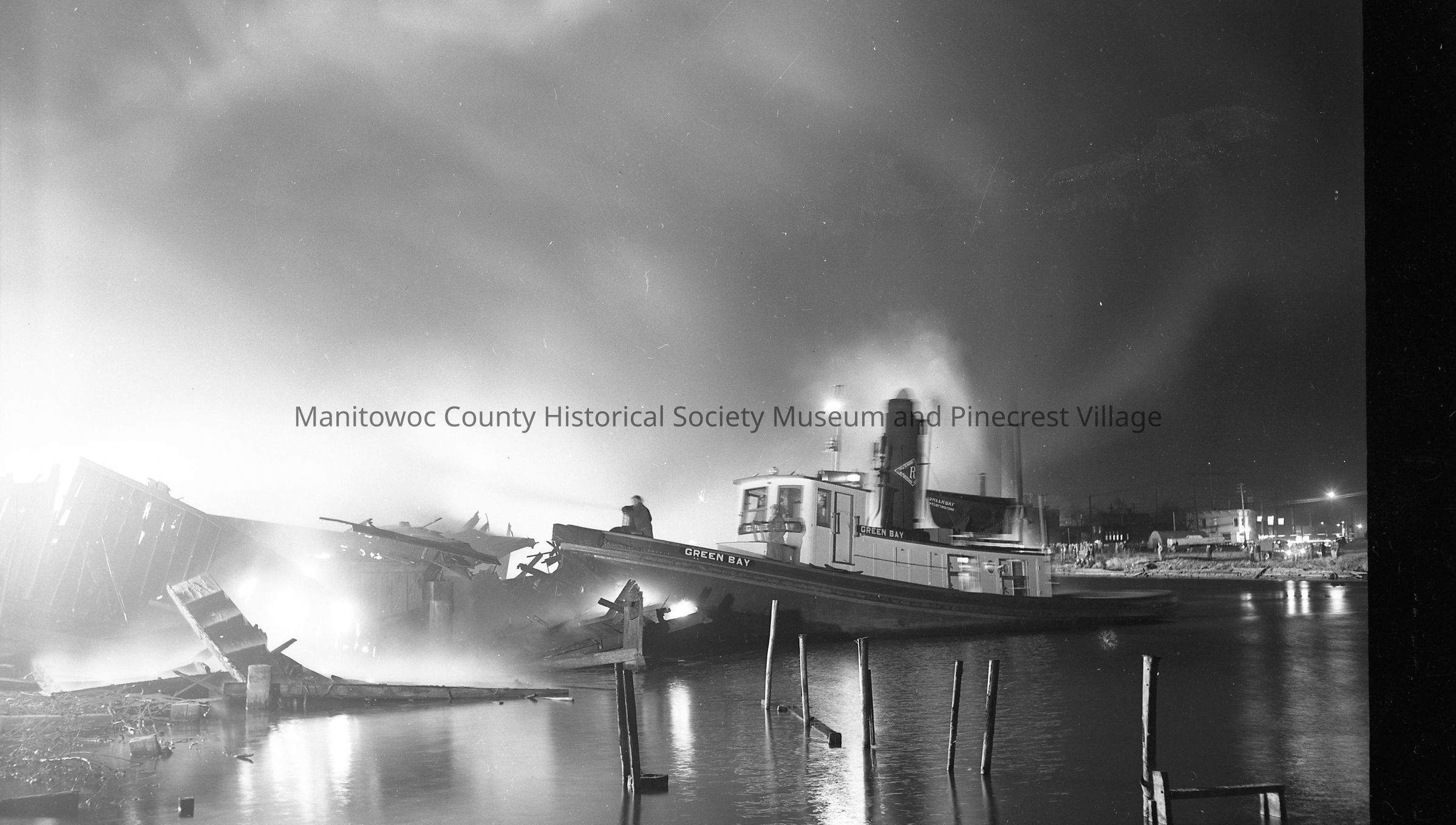 Soo Line RR warehouse fire, Manitowoc; C. Reiss Coal Company tug, Green Bay, helps fight the fire. Photograph taken on October 28th, 1952 by Daryl Cornick.Made/Created