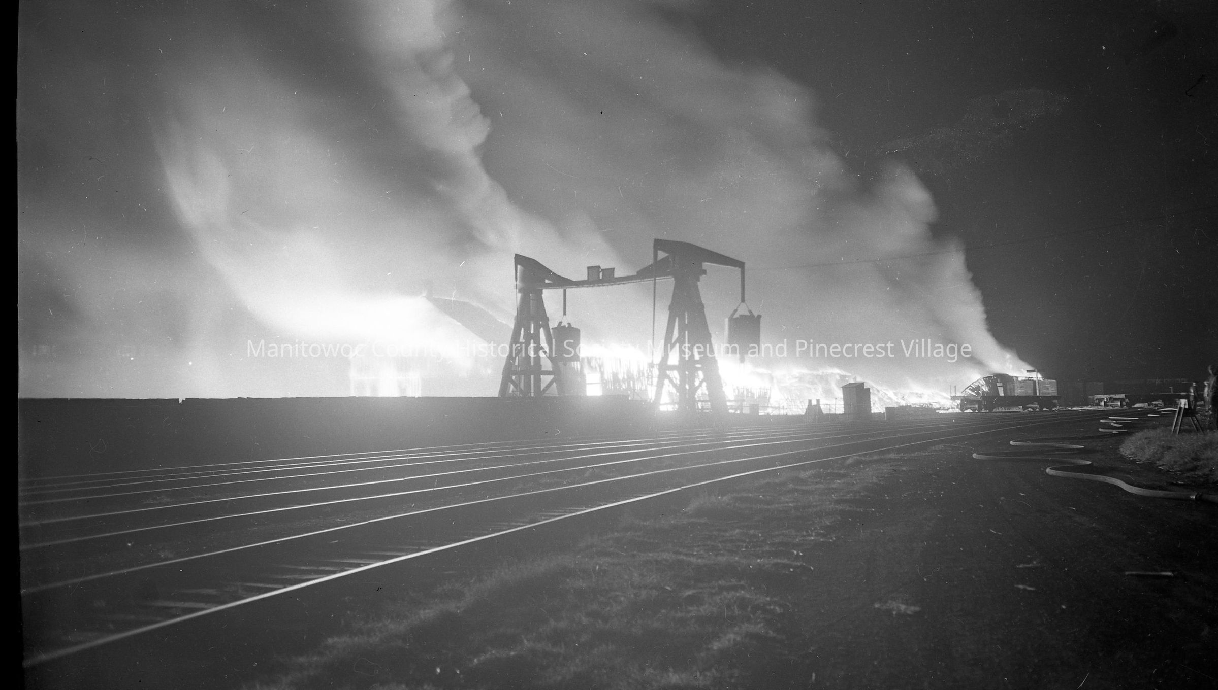 Soo Line warehouse fire, Manitowoc; looking from near North 10th Street at the carferry slip. Photograph taken by Daryl Cornick on Octobre 28th, 1952.Made/Created