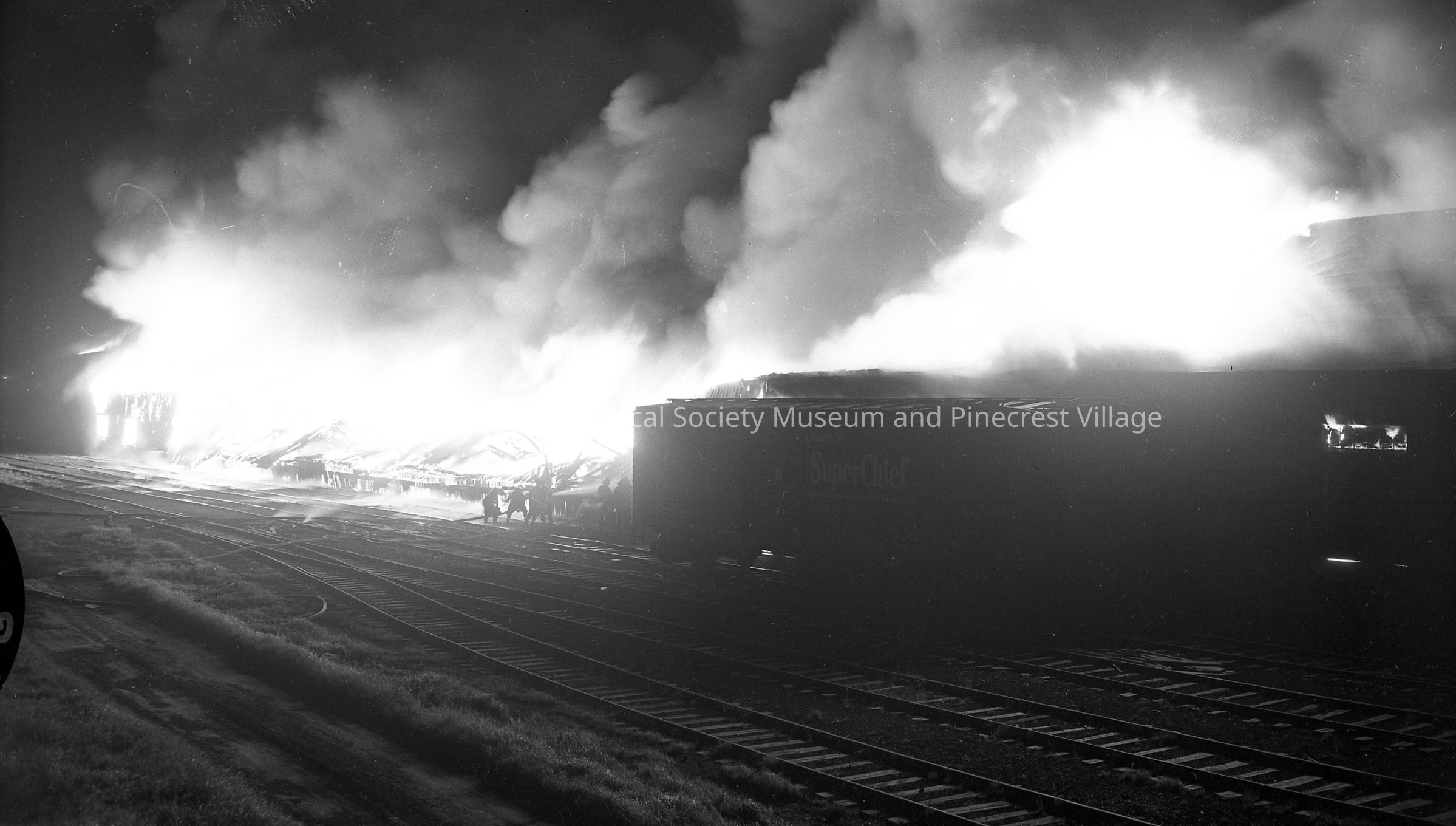 Soo Line RR warehouse fire, Manitowoc; looking South/East as fire nears box cars. Photograph taken on October 28th, 1952 by Daryl Cornick.Made/Created