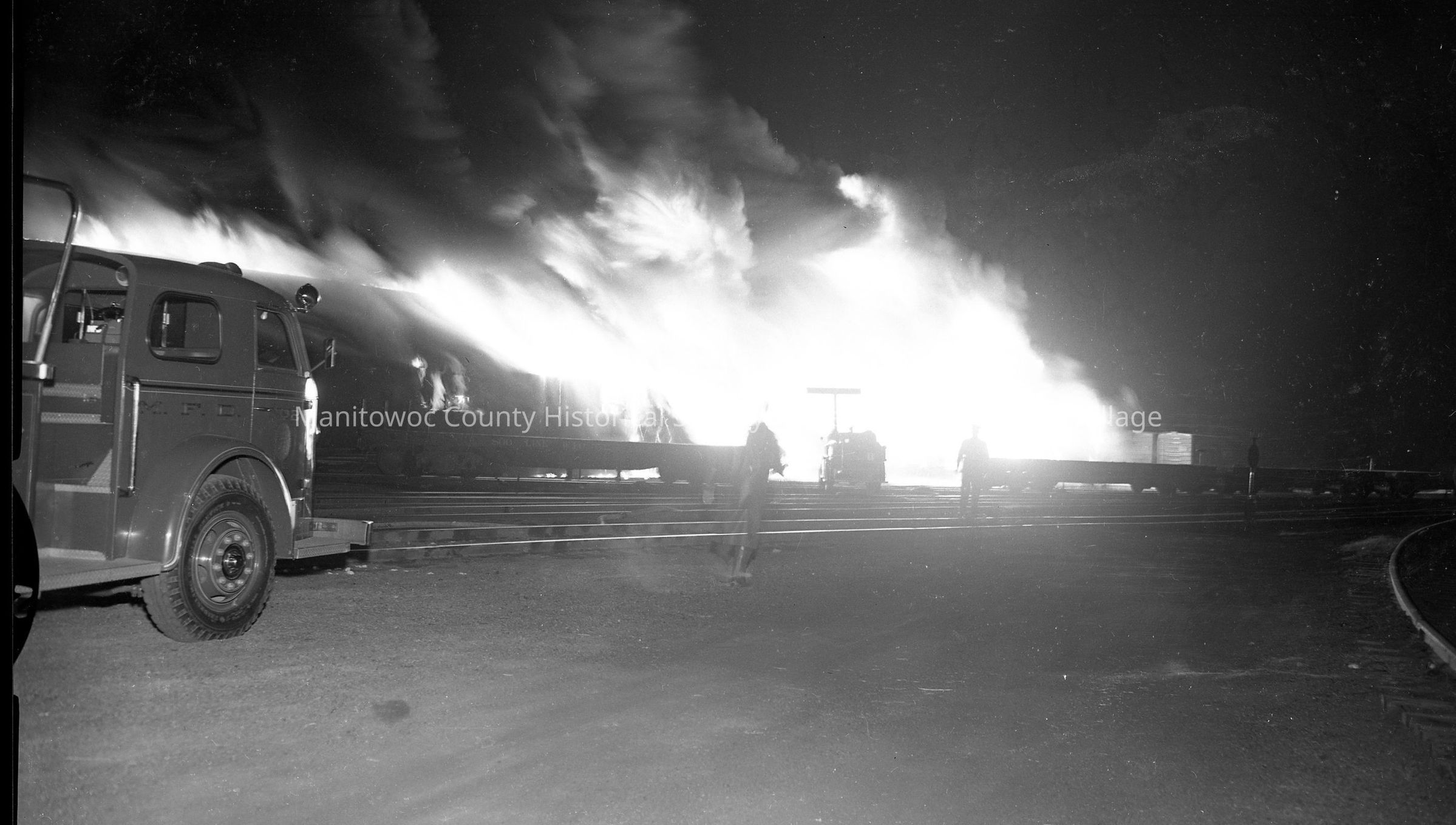 Soo Line RR warehouse fire, Manitowoc; looking west from in the railyard. Manitowoc fire engine #2 is at left. Photograph taken on October 28th, 1952 by Daryl Cornick.Made/Created