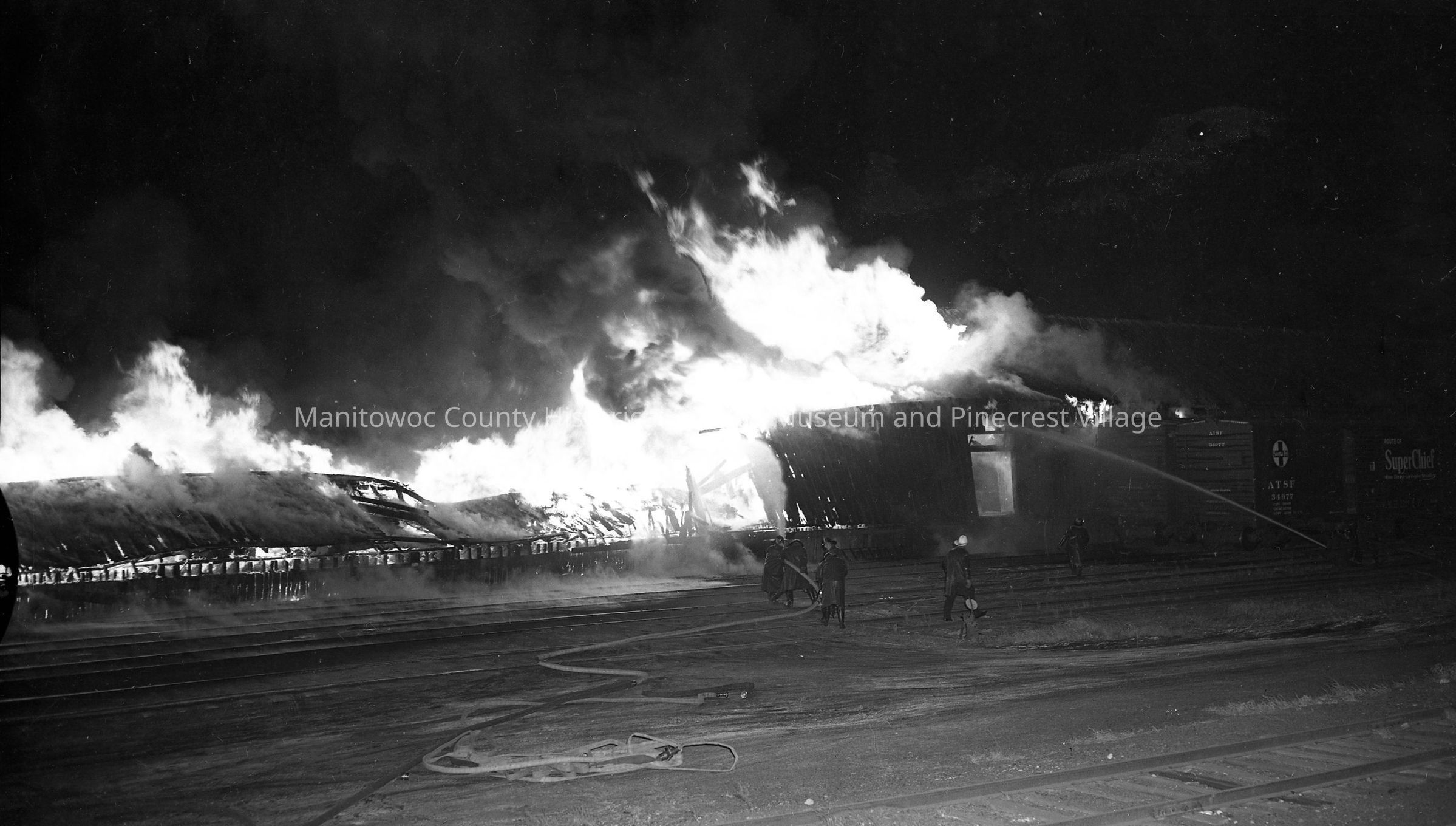 Soo Line RR warehouse fire, Manitowoc; looking South/West as fire burns box cars. Photograph taken on October 28th, 1952 by Daryl Cornick.Made/Created