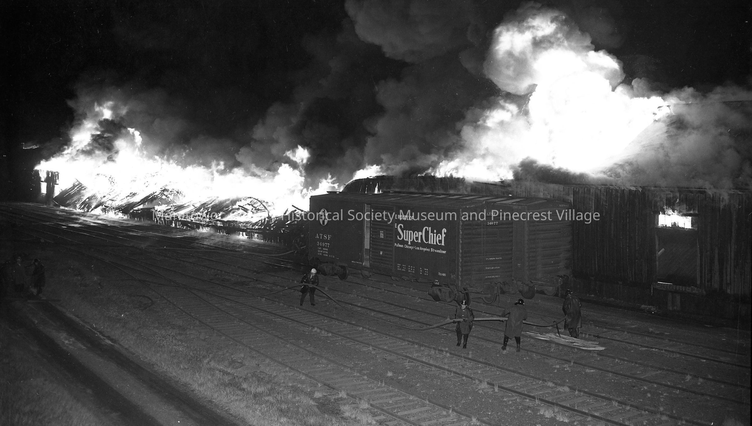 Soo Line RR warehouse fire, Manitowoc; looking South/East as firefighters reposition around box cars. Photograph taken on October 28th, 1952 by Daryl Cornick.Made/Created