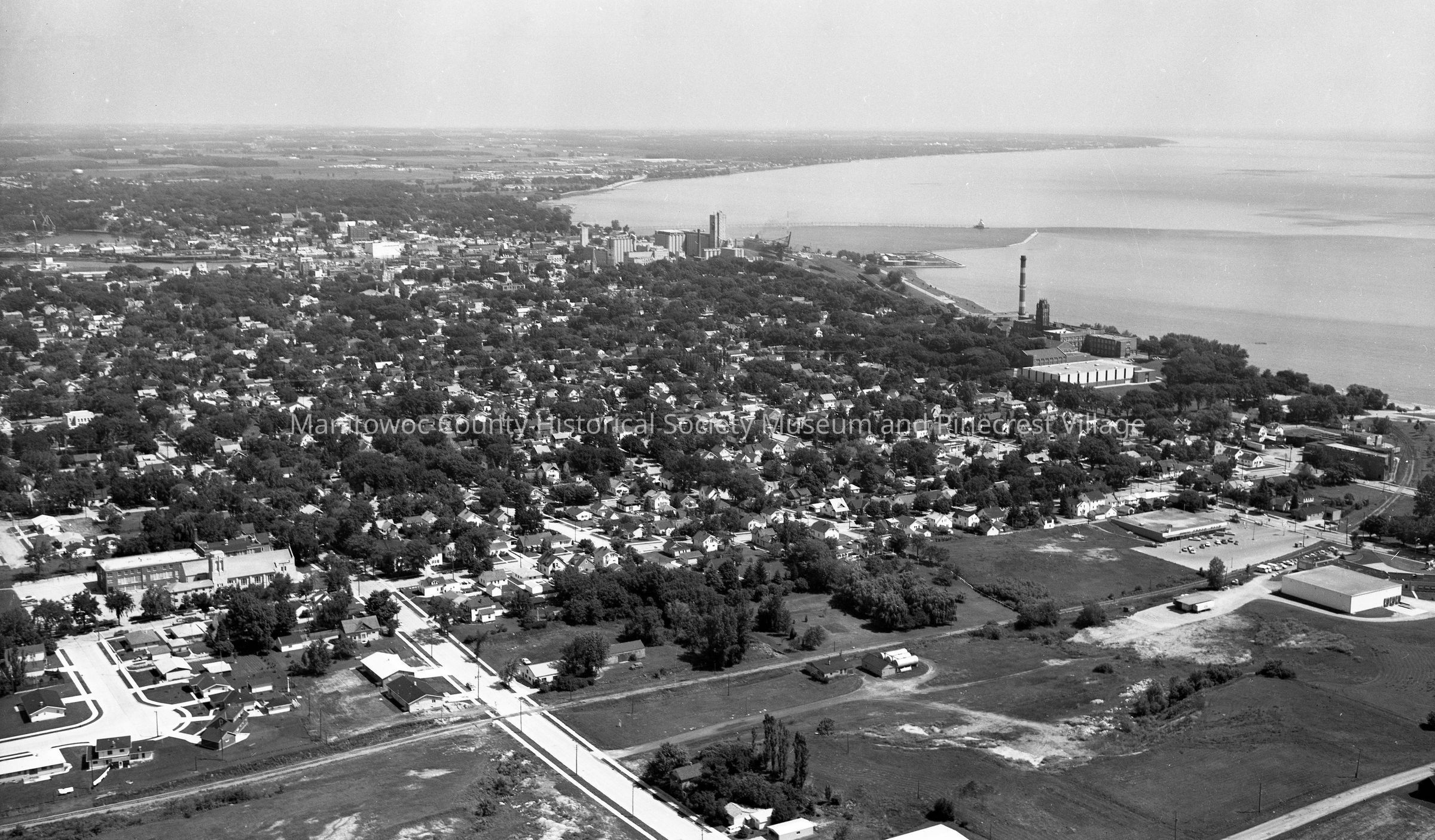 Aerial view of South 14th at Dewey Street Manitowoc. At right edge is Stangels Super Value store, 1920 and Sorge Dairy, 2000 South 10th Street. Left edge is St. Andrew Catholic Church and School, 1808 South 14th Street. Photograph taken on July 30th, 1969.Made/Created