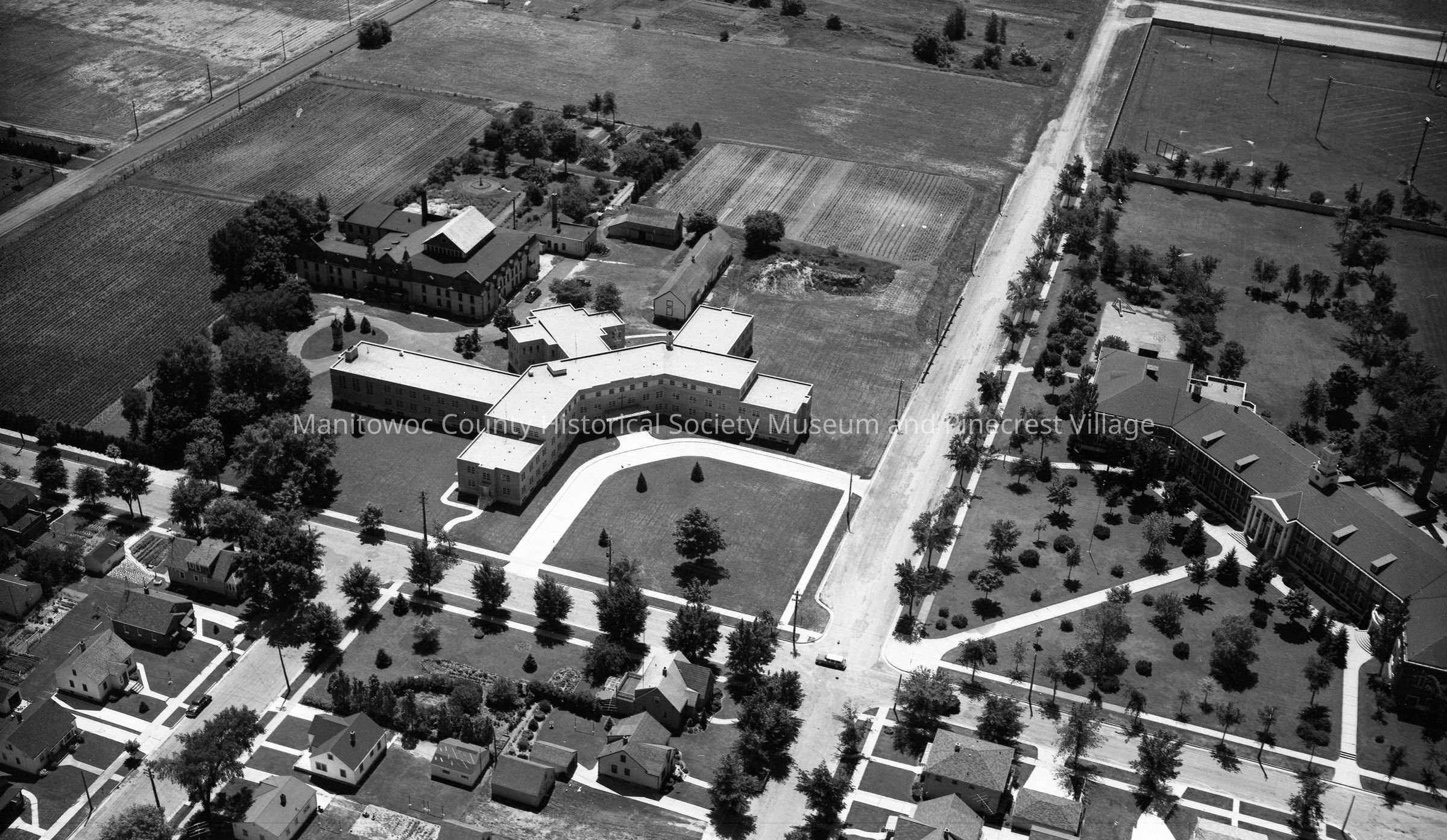 Aerial of the intersection of South 21st and Division Street Manitowoc. Looking south at right is Washington Junior High School, 2101 and St Mary Home for the Aged, 2005 Division Street. At top left is Green Street. Photograph taken in October 1953.Made/Created