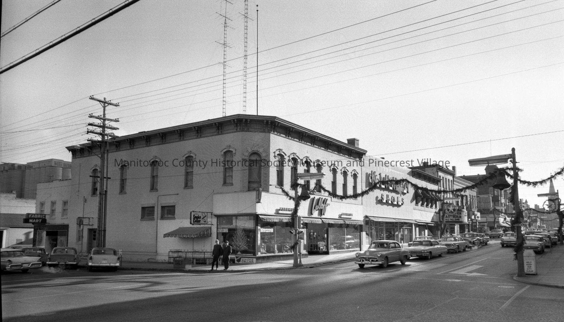 South 8th & Franklin Street Manitowoc. On corner is Lulloff Furniture, 901 South 8th; Kinney Shoe store, 905; McNeils, 909; Johnson Shoe store, 913; Capitol Theater, 913; Singer Sewing Center, 915; Jerrold's Clothing, 917; Buerstatte Drugs, 919 South 8th street. At left is Fabric Market, 719 Franklin Street. Photograph taken on December 11th, 1962.Made/Created