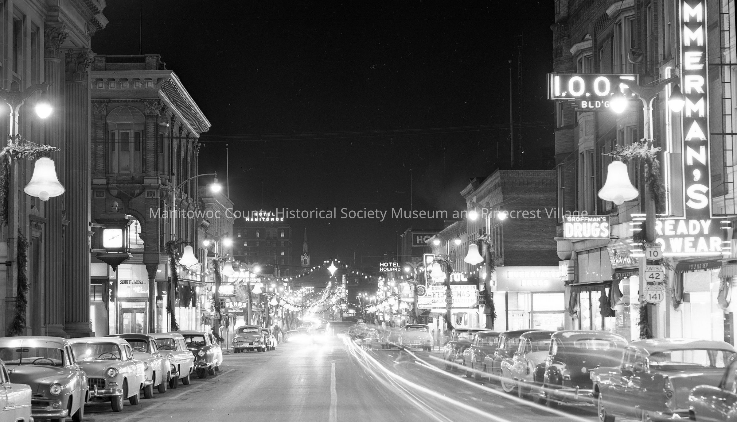 Aerial view of South 8th Street looking north from Washington Street Manitowoc. Left is Manitowoc Savings Bank, 924 South 8th and Schuette Department Store, 804 Jay Street. Right is Zimmerman Ready to Wear, 931; Groffman Drug, 925; Berk's Apparel Shop, 923; Buerstatte Drugs, 919; and Capitol Theater, 913 South 8th street. Christmas decorations are up; night photo. Photograph taken on December 20th, 1955.Made/Created