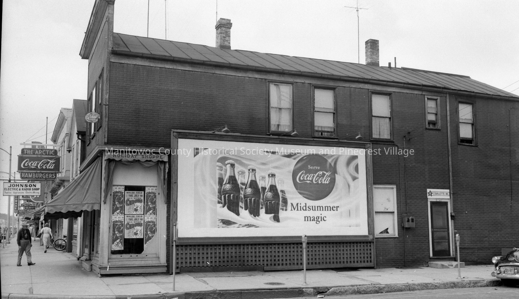 South 9th & Washington Street Manitowoc looking at the Bowe Howie Music store, 902; Gambles Radio, 904; Arctic Ice Cream, 906; and Johnson Electric & Radio, 908 Washington Street. Photograph taken on July 18th, 1953.Made/Created