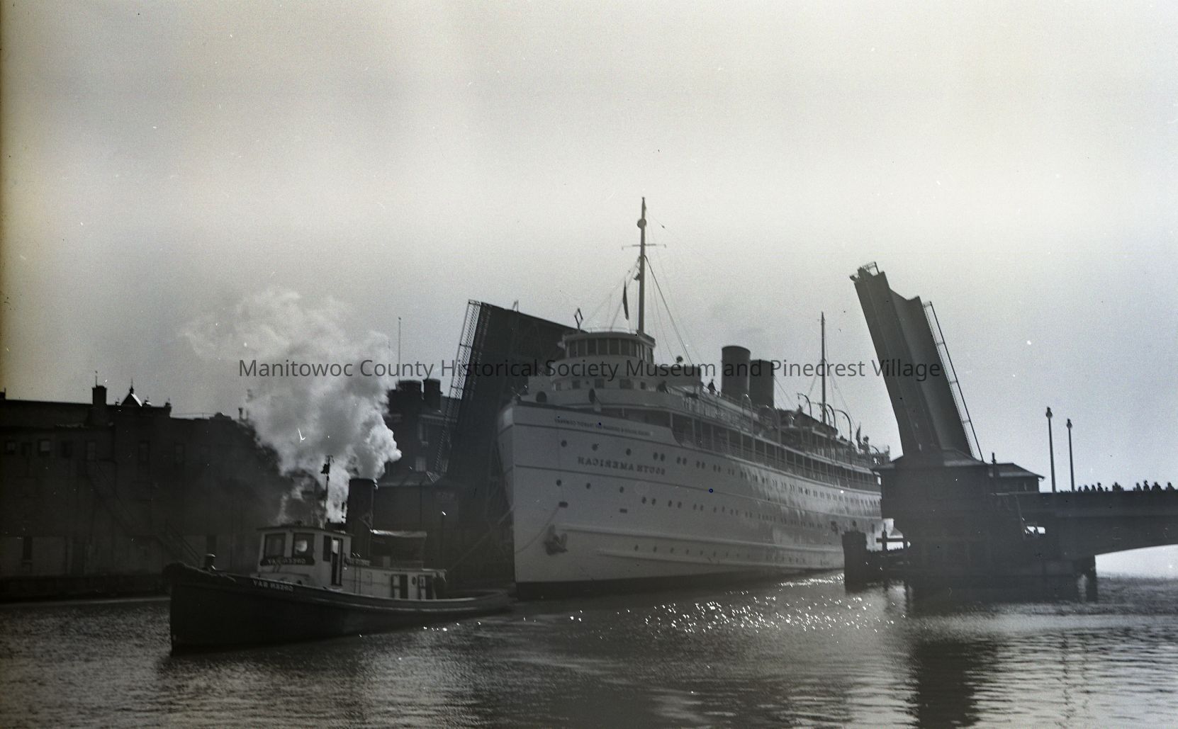 South American coming through 8th Street bridge towed by tug Green Bay. Photograph taken on May 6th, 1946.